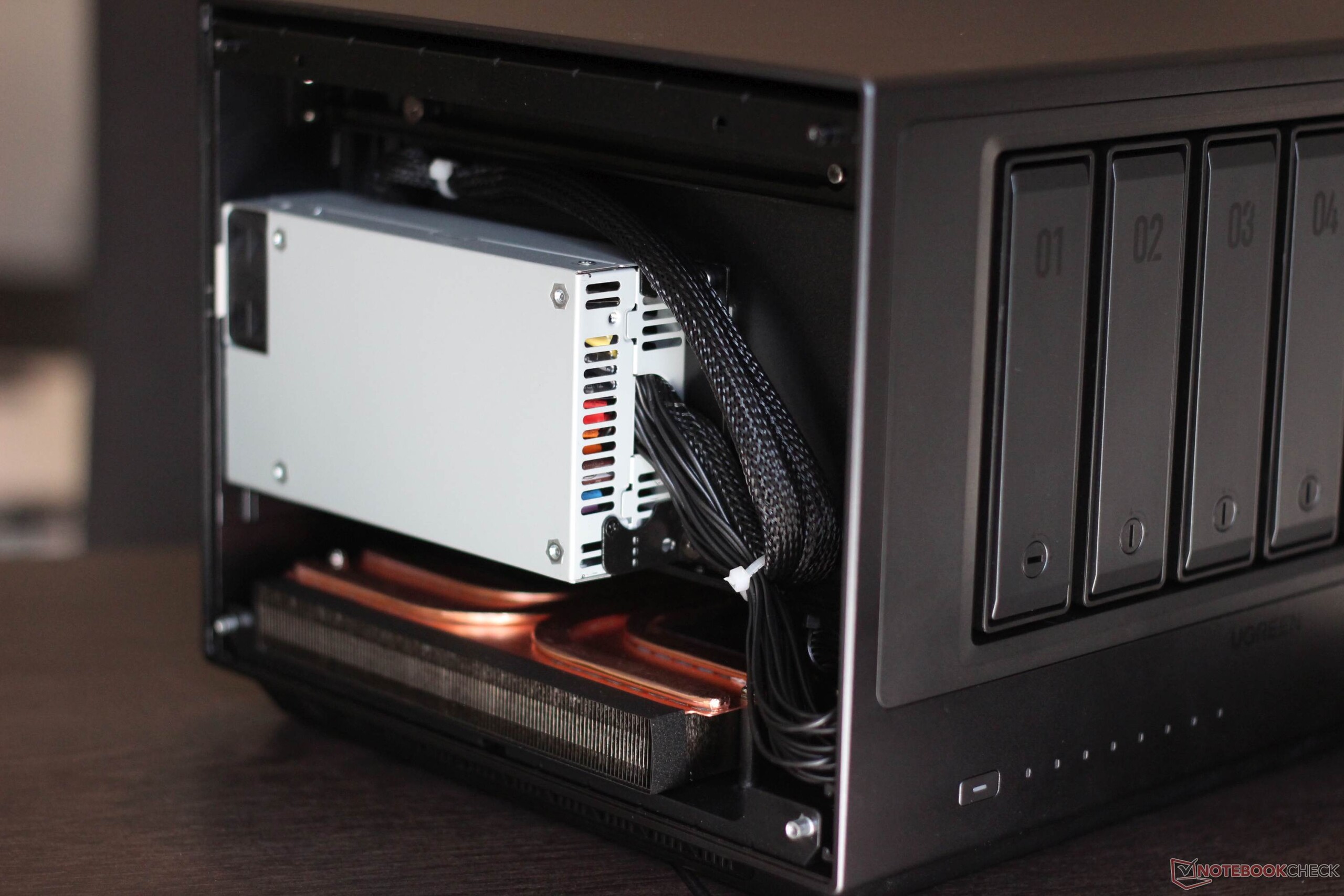 Les deux panneaux latéraux sont amovibles. Sur le côté droit, il y a de la place pour deux SSD M.2, et une carte PCIe peut également être ajoutée ultérieurement. Ce n'est pas particulièrement inhabituel pour un NAS. Cela permet par exemple d'installer une carte réseau supplémentaire.