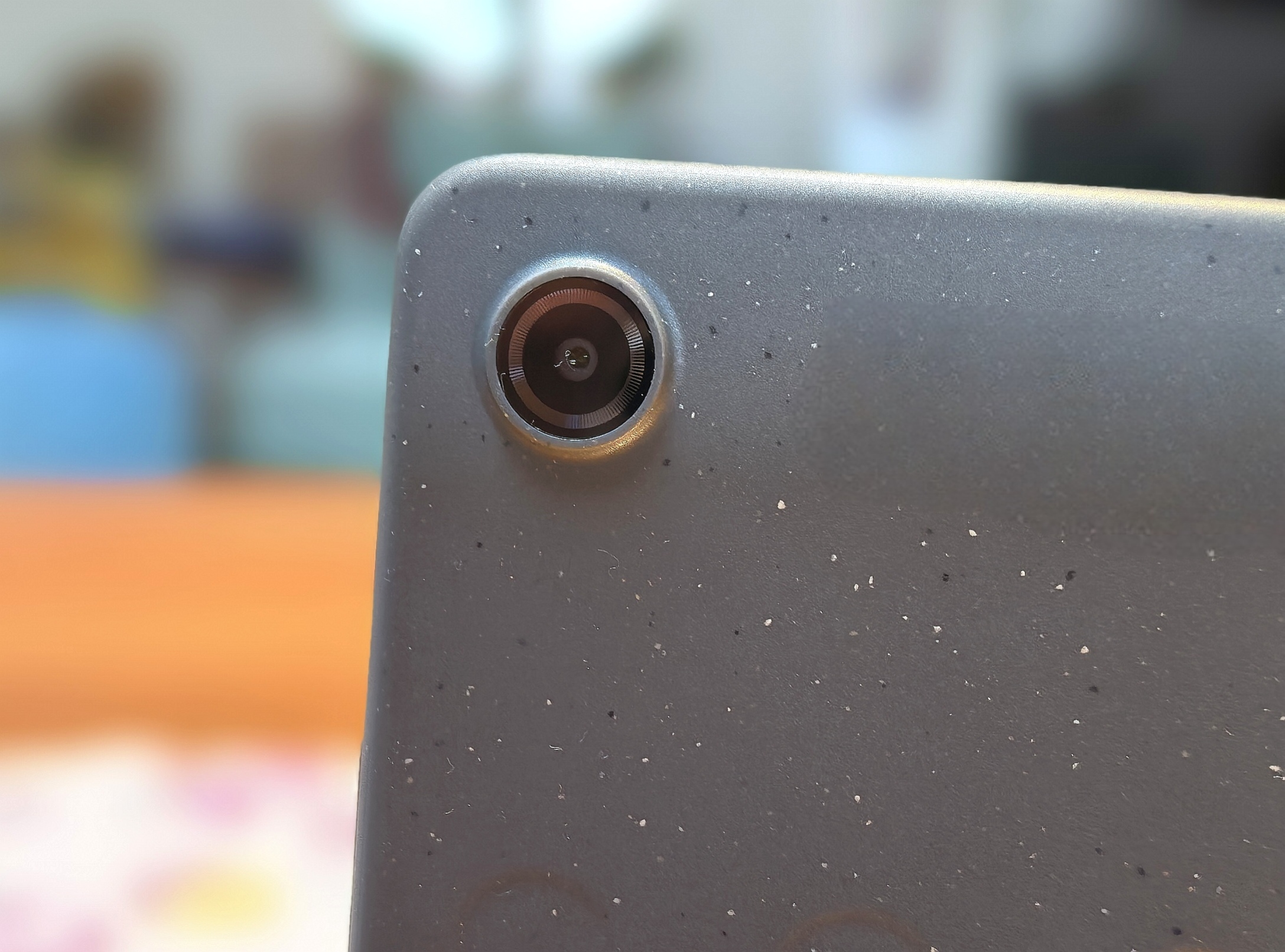 La Lenovo Tab K9 est disponible en gris compatible avec les entreprises. Elle présente de petites taches de plastique de couleur différente, ce qui s'explique par le fait que Lenovo utilise 35 % de matériaux recyclés. Avec le motif circulaire au dos, cela donne un aspect intéressant qui rappelle un sol en terrazzo.