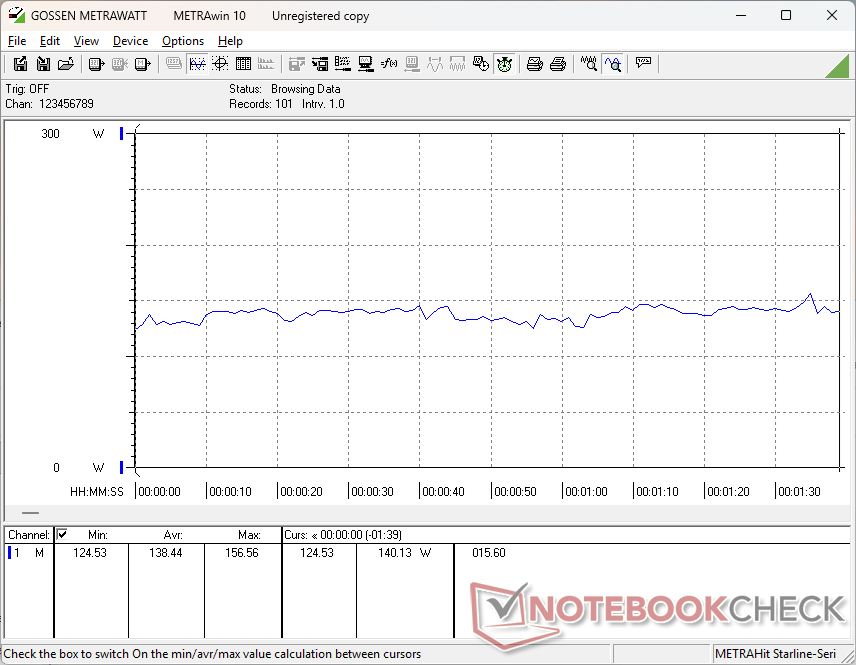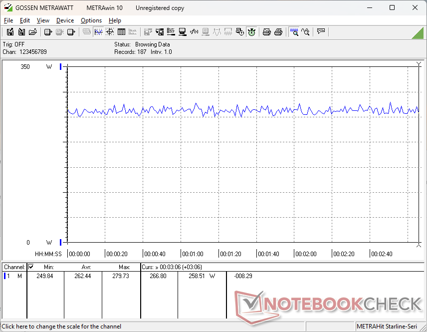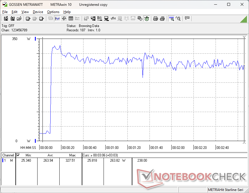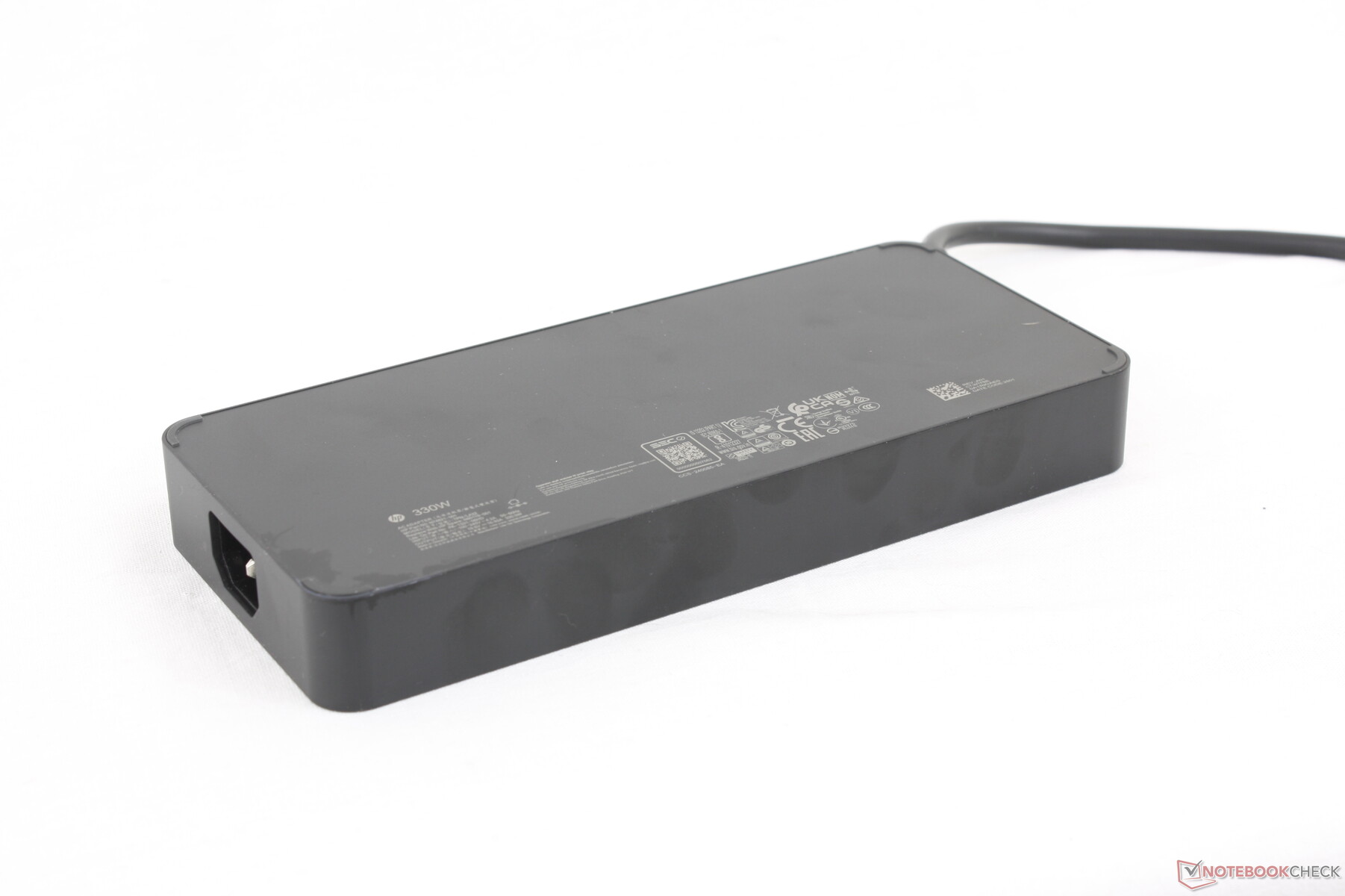 Le HP est livré avec un adaptateur secteur de 330 W tandis que le Dell est livré avec un adaptateur secteur USB-C de 280 W. La consommation maximale est donc plus élevée sur le HP où elle peut atteindre jusqu'à 328 W dans nos tests contre 281 W sur le Dell, mais cette forte consommation est de courte durée en raison des limitations thermiques ou des plafonds imposés. Lors de l'exécution simultanée de Prime95 et FurMark, par exemple, la consommation atteignait un pic de 328 W avant de se stabiliser rapidement autour de 265 W, comme nous l'avons observé sur le Dell. Ainsi, en termes de performances, l'adaptateur CA de 330 W n'a que peu d'importance.