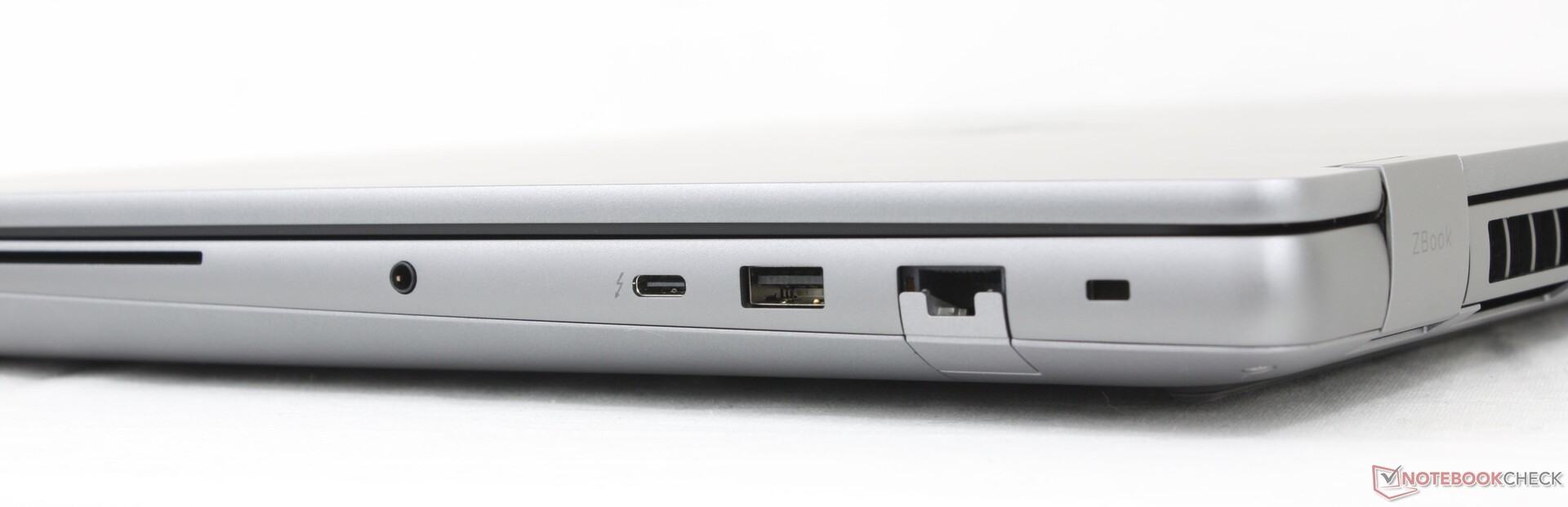 Le modèle dispose de tous les ports présents sur le Dell Pro Max 18 Plus, mais avec un port USB-A en moins. Notre principal reproche est que les deux ports USB-C situés le long du bord gauche sont trop proches du port de l'adaptateur secteur. Il est donc difficile de brancher plusieurs câbles.