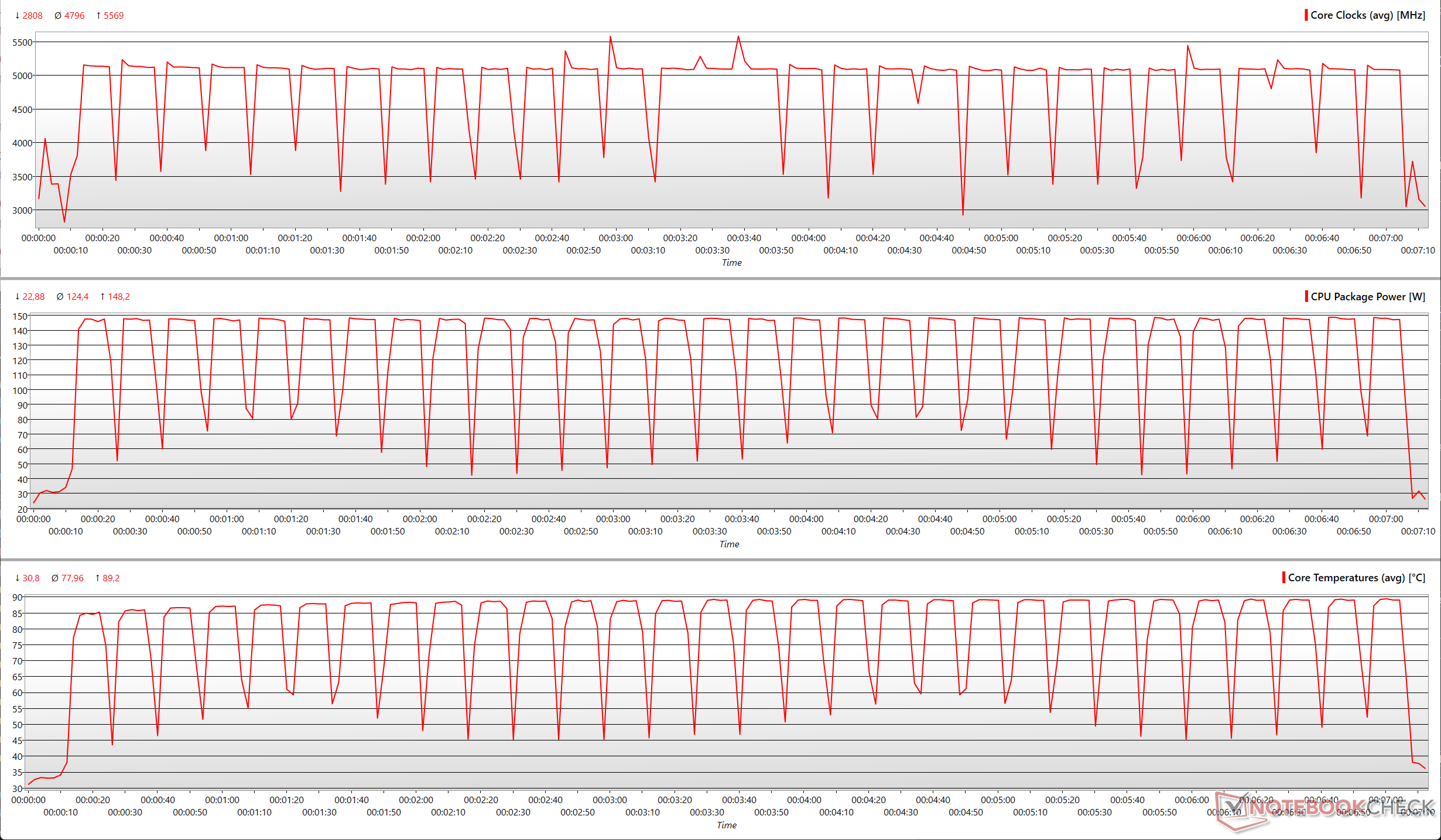 Lors d'une exécution multicœur Cinebench R15 en 30 boucles, la Ryzen 7 9850X3D monte en puissance jusqu'à 5,57 GHz, atteignant une puissance maximale de 148 W et une température maximale du cœur de 89 °C.