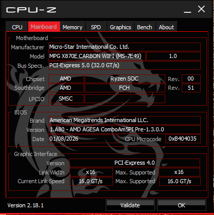 - Carte mère MSI MAG X870E Carbon Wi-Fi avec BIOS 1.A80 (AGESA ComboAM5PI Pre-1.3.0.0)