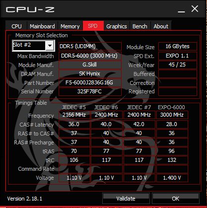 - 2x 16 GB G.Skill Trident Z5 Neo RGB DDR5-6000 RAM fonctionnant dans le profil EXPO-6000 avec les timings 28-36-36-96 à 1.40 V