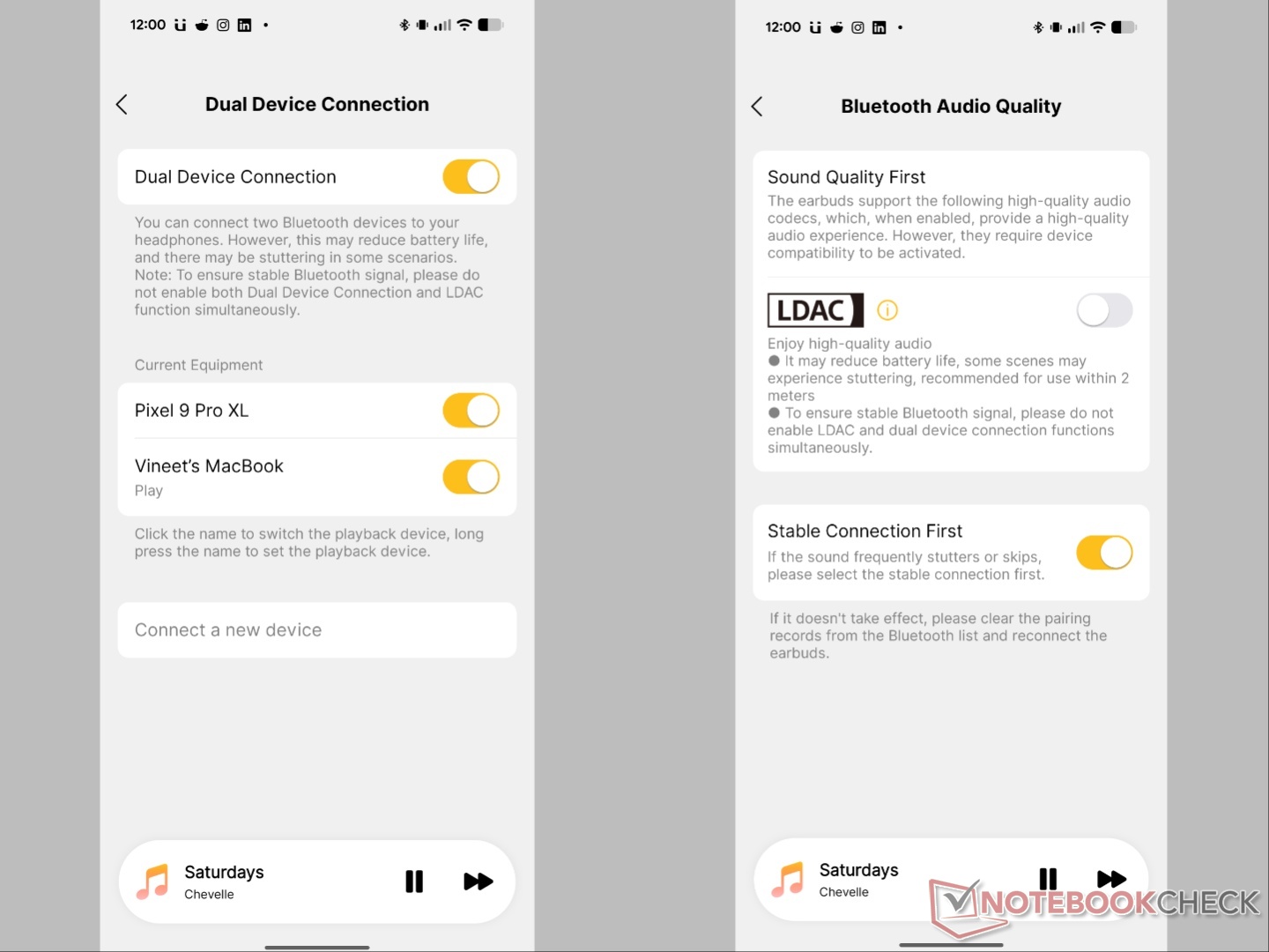 LDAC fonctionne comme prévu, et nous avons remarqué une légère amélioration de la sortie audio lorsque l'appareil est couplé au Pixel 9 Pro XL, et que LDAC est activé dans les options du développeur. Lorsque LDAC est activé, il n'est pas possible d'utiliser la connexion à deux appareils. En parlant de cela, l'appairage avec deux appareils - le Pixel et un MacBook Air M4 - a fonctionné comme annoncé, les écouteurs basculant automatiquement vers la source dont l'audio est actif. Cependant, nous avons remarqué qu'après avoir sorti les écouteurs de l'étui et qu'ils se soient automatiquement connectés aux deux appareils, la lecture de musique sur le téléphone n'envoyait pas de son aux écouteurs. Le fait de se déconnecter du MacBook Air a permis de renvoyer à nouveau le son du téléphone, ce qui indique qu'ils détectaient faussement l'entrée audio du MacBook Air, même si aucune musique n'était jouée. Une fois déconnectés et reconnectés au MacBook Air, les écouteurs ont fonctionné comme ils le devaient. Mais le problème revient souvent.