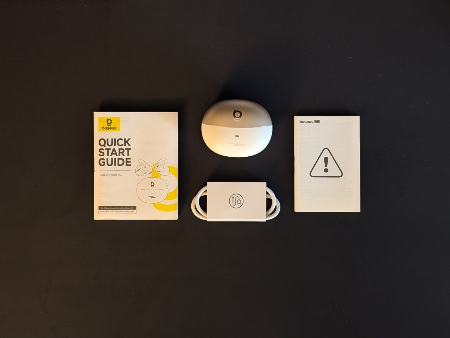 Le déballage des Baseus Inspire XC1 est simple et l'emballage minimal. Comme il s'agit d'écouteurs de style clip-on, il n'y a pas d'embouts en silicone. L'emballage de détail contient un guide de démarrage rapide et un câble de charge USB Type-C.