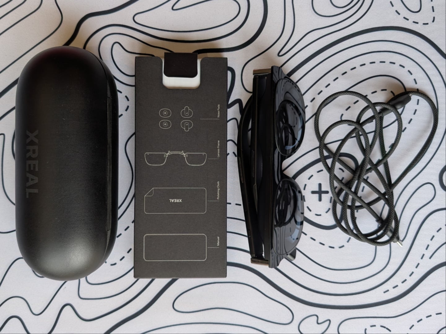 Les lunettes Xreal One Pro sont soigneusement emballées dans une boîte noire avec des accents dorés pour une sensation premium. À l'intérieur, elles sont placées dans un étui relativement grand qui offre de la place pour le câble USB Type-C et les lunettes. Xreal fournit également un chiffon en microfibre, une monture de lentilles et des plaquettes de nez de différentes tailles pour une expérience visuelle idéale. Ceux qui ont besoin de verres correcteurs (comme moi) reçoivent un ensemble livré séparément par HonsVR.