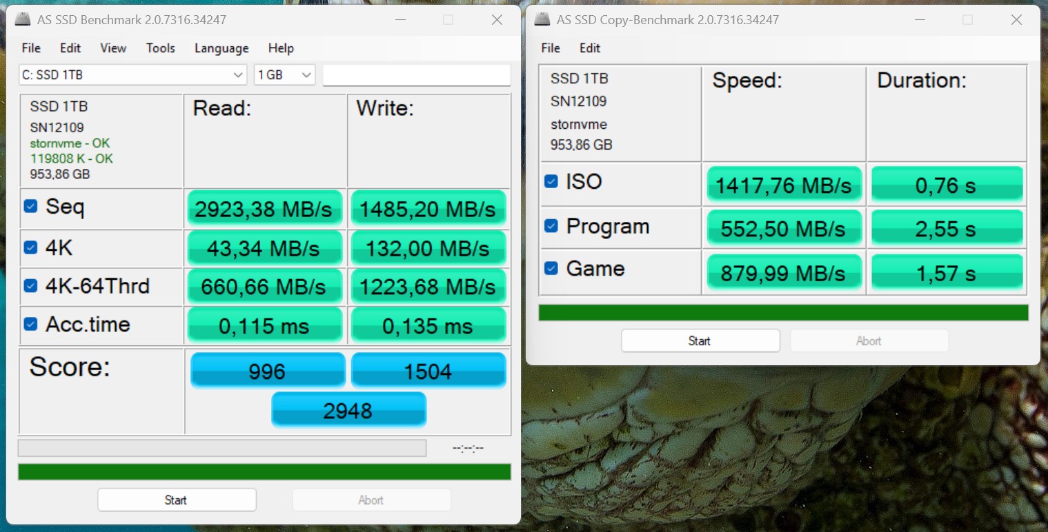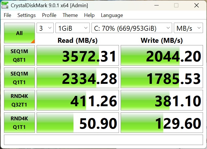 L'Alliwava GH8 est équipé d'un disque dur SSD de 1 To, dont le fabricant n'est pas précisé. En raison de la connexion via PCIe 3.0 x4, il ne s'agit pas de l'un des modèles les plus rapides et il se situe dans la partie inférieure du tableau de comparaison en termes de performances. Cependant, les performances sont suffisantes pour les tâches quotidiennes et le SSD fonctionne de manière stable sous une charge continue.