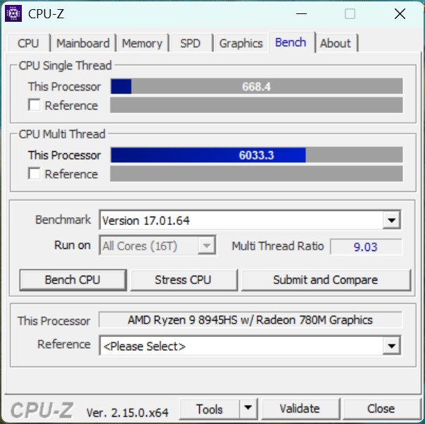 L'Alliwava GH8 avec AMD Ryzen 9 8945HS (Zen 4, 8 cœurs et 16 threads) offre une puissance de calcul globale élevée et se positionne dans le milieu de gamme puissant des mini PC actuels. Le SoC peut atteindre une consommation d'énergie à court terme d'environ 65 watts, mais se stabilise à environ 55 watts sous une charge soutenue. Dans une comparaison directe, notre échantillon de test perd cependant face au Geekom A8, qui est équipé d'un AMD Ryzen 7 8745HS supposé plus faible.