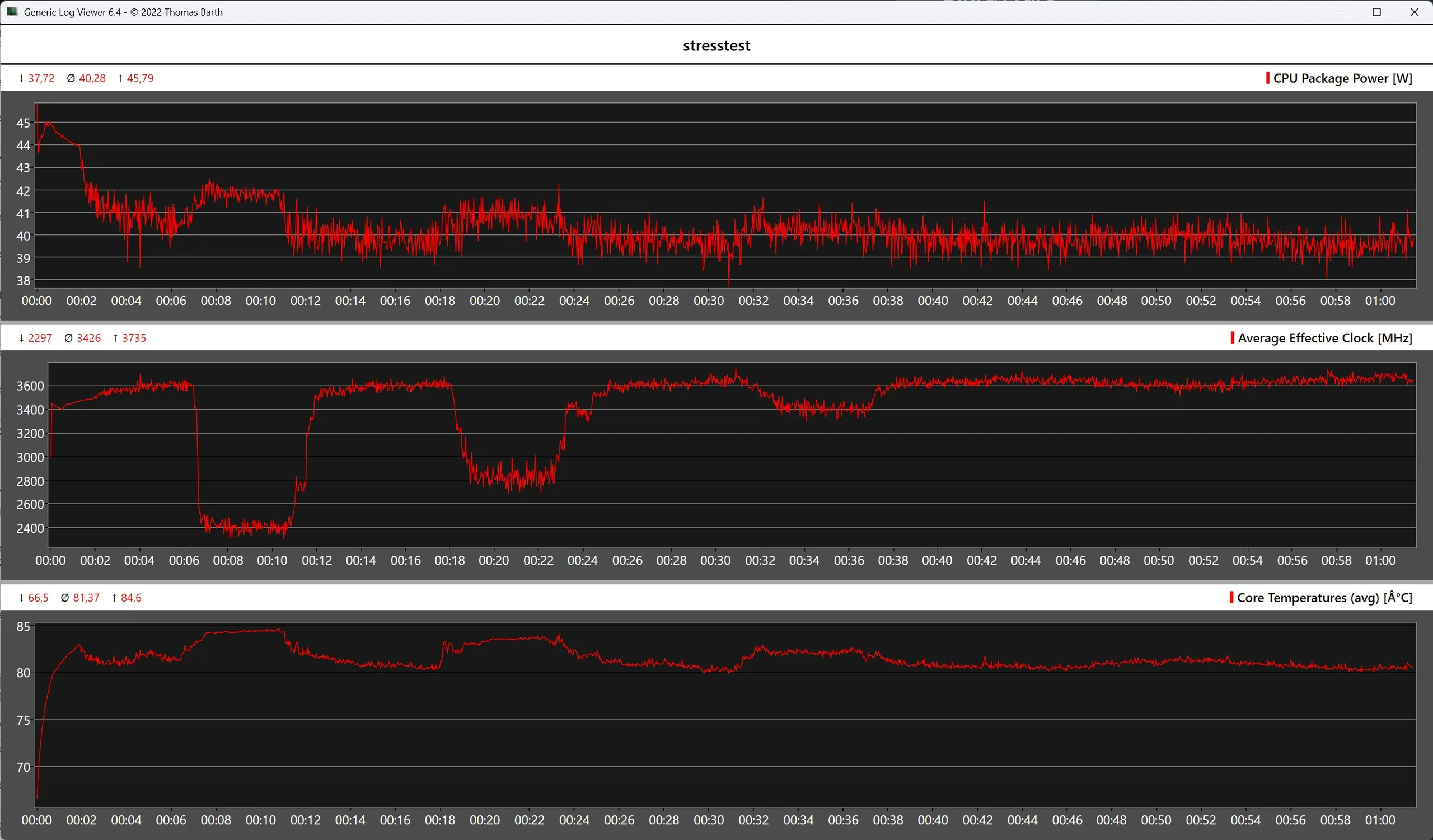 Le test d'endurance Cinebench R15 prouve que le système de refroidissement de l'Alliwava GH8 est globalement bien réglé. Bien qu'une légère baisse de performance ne puisse être totalement évitée en cas de charge soutenue, elle est modérée. L'AMD Ryzen 9 8945HS atteint brièvement une consommation d'énergie d'environ 40 watts, tandis que la température maximale est légèrement inférieure à 84 degrés Celsius.
