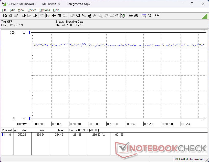 L’exécution de charges exigeantes comme Cyberpunk 2077 sollicite près de 260 W de l’adaptateur secteur USB-C de 280 W (~16,2 × 7,8 × 2,3 cm). Attendez-vous à des taux de charge très lents si vous exécutez des charges lourdes simultanément. À titre de comparaison, le HP ZBook Fury G1i 18 est livré avec un adaptateur secteur plus volumineux de 330 W, permettant potentiellement des performances maximales plus élevées et des vitesses de charge plus rapides.