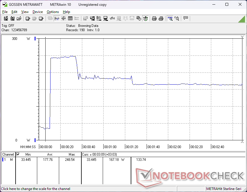Les durées d’utilisation sont étonnamment longues lors de la navigation web en mode graphique intégré et avec le profil d’alimentation Balanced. Nous avons obtenu plus de 9 heures d’usage réel, soit plusieurs heures de plus que ce que nous avons mesuré sur le Lenovo ThinkPad P16 ou le HP ZBook Studio 16 G11.