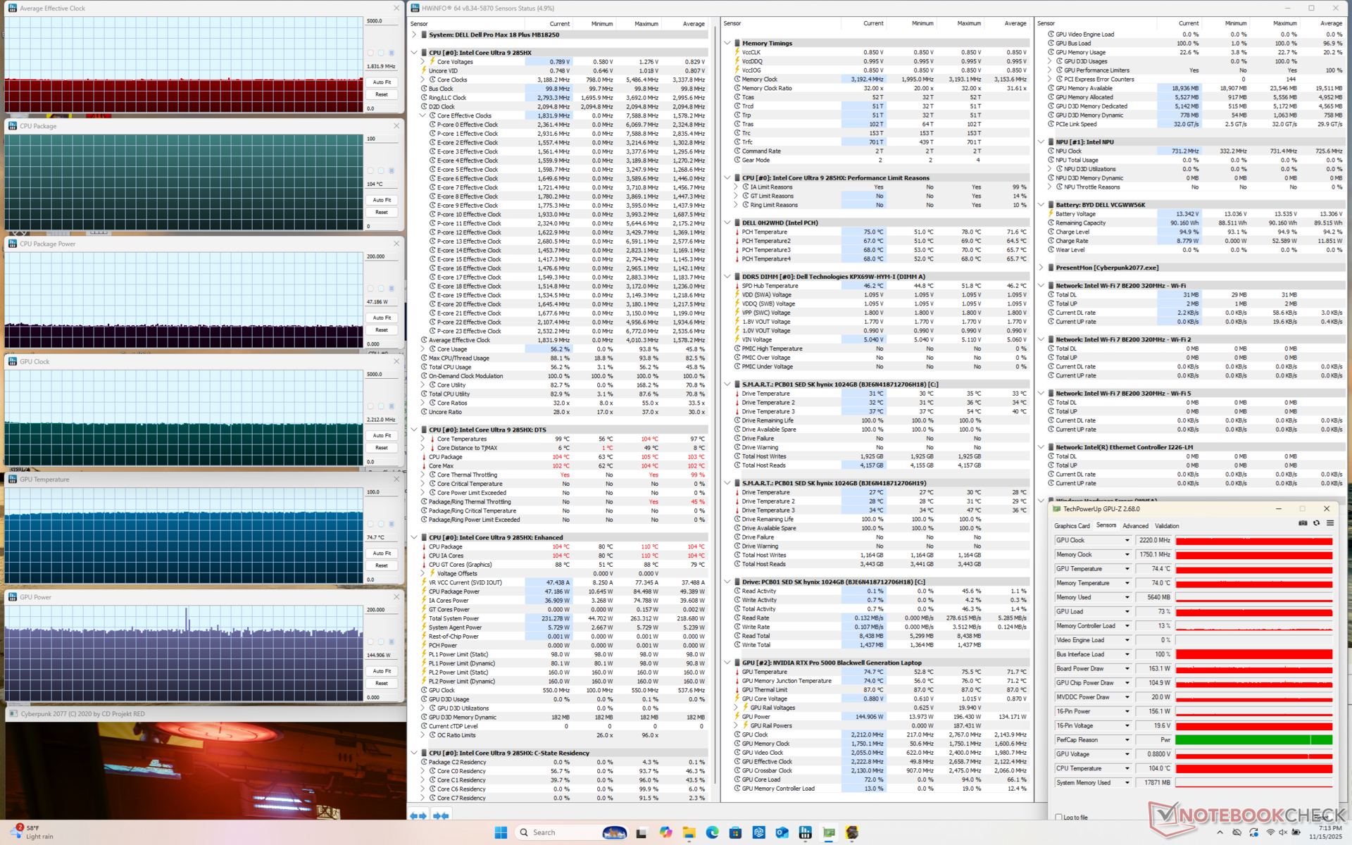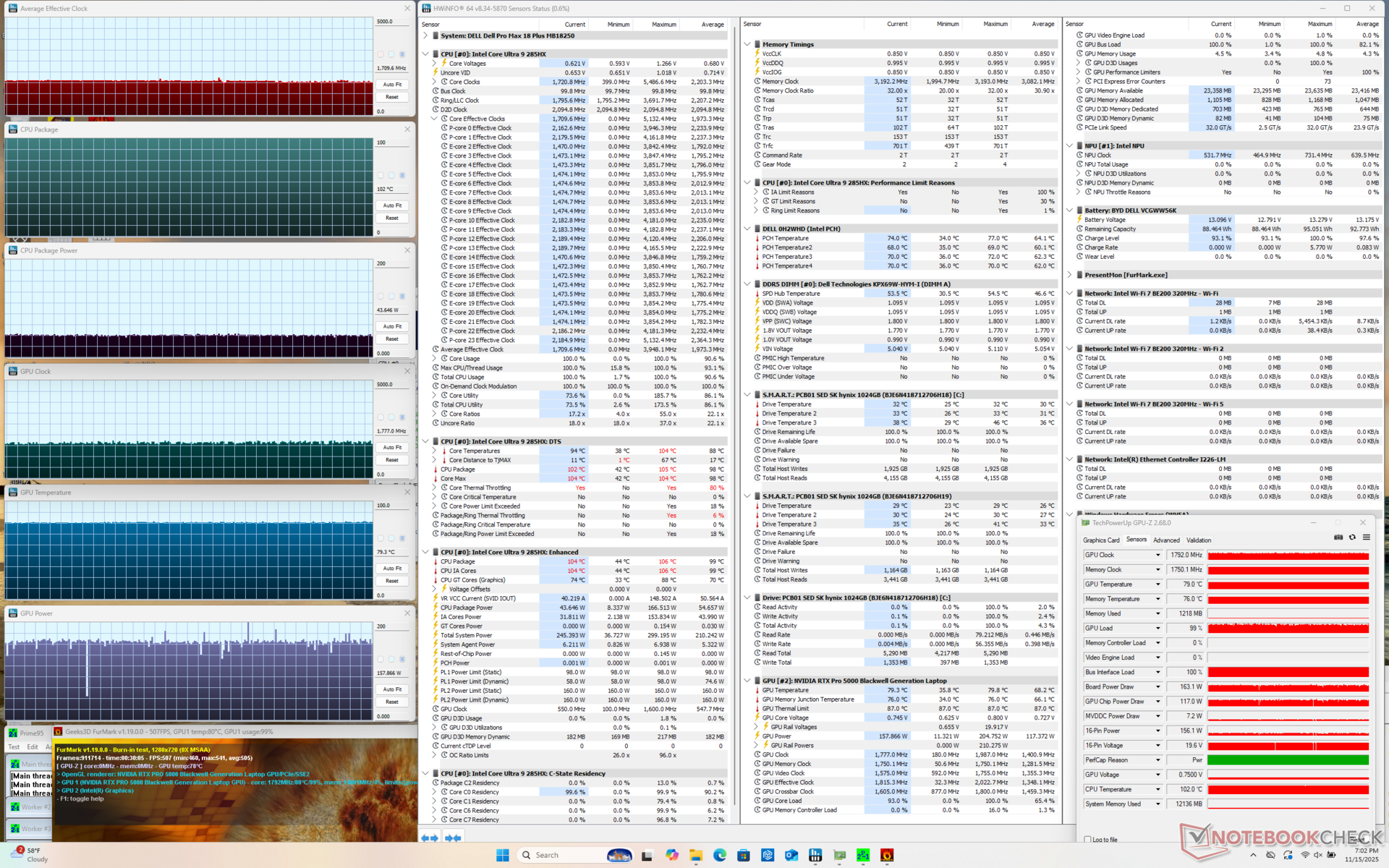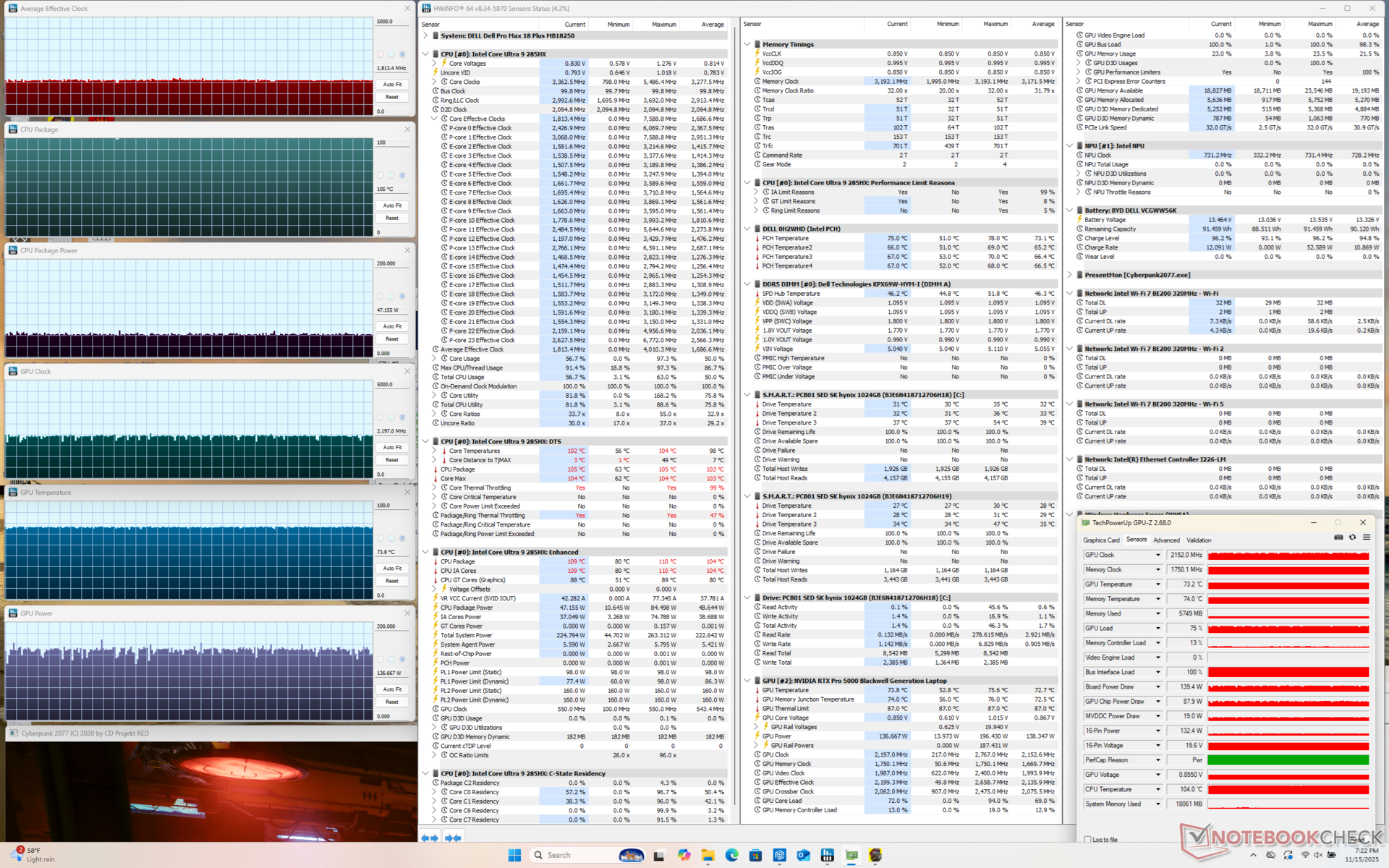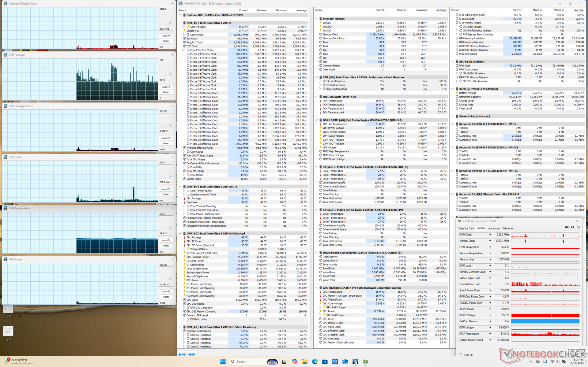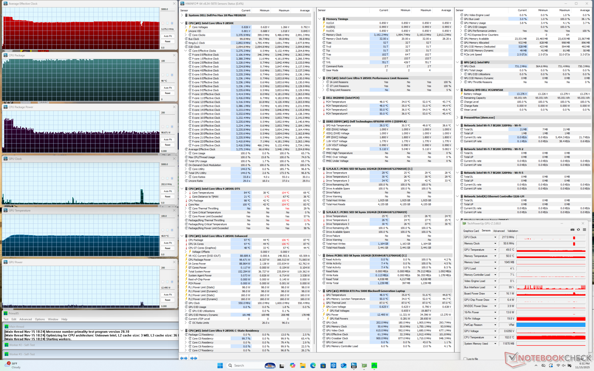 Aussi étonnantes que soient la qualité de fabrication et la conception matérielle, les performances pourraient encore être améliorées. Le processeur chauffe trop (environ 100 °C) lorsqu’il est sollicité, ce qui a un impact sur les performances du Turbo Boost. Des éléments tels que la solution de refroidissement, le clavier et les options de ports restent essentiellement les mêmes que sur le plus petit modèle Dell Pro Max 16 Plus malgré la différence de taille. Le manque d’options d’affichage, en particulier, peut décevoir les utilisateurs, d’autant plus que le modèle de 16 pouces propose au moins trois panneaux, dont un OLED 4K.