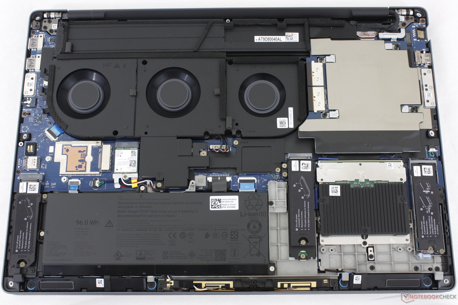 En retirant le panneau inférieur, on découvre deux emplacements pour SSD M.2 2280 PCIe 5.0 x4, un emplacement pour RAM CAMM2, un module WLAN amovible, un GPU au format DGFF et un emplacement WAN. Un adaptateur CAMM2 vers SODIMM est disponible si les utilisateurs préfèrent l’ancien standard.
