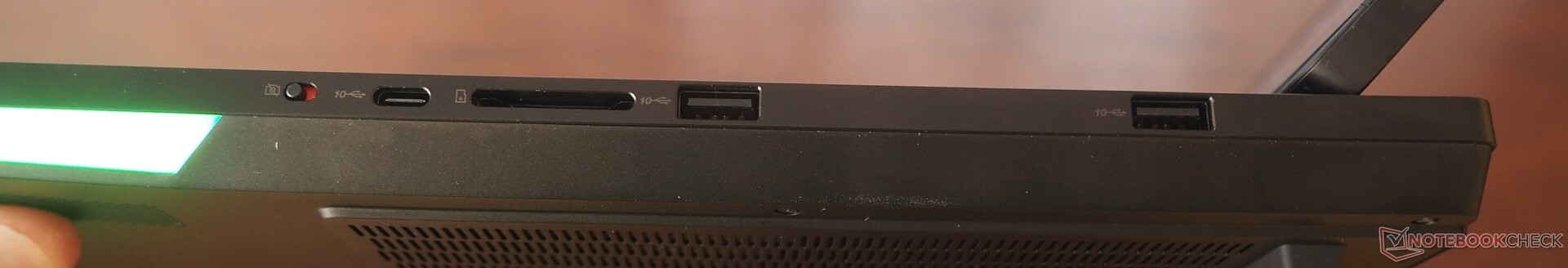 Le nombre et la variété des connexions ne laissent rien à désirer, d'autant plus que Lenovo a installé des interfaces modernes (voir ci-dessous). Il est intéressant de noter que le lecteur de cartes est plus lent que sur la version RTX 5080, alors que le module sans fil donne de bien meilleurs résultats. La webcam de 5 MP, qui offre un e-shutter, produit des images correctes.