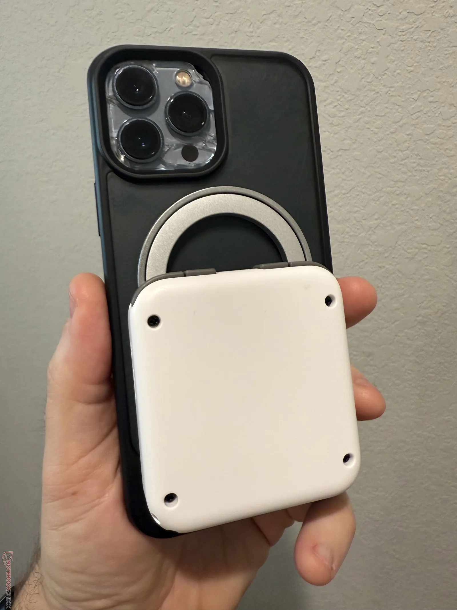 L'aimant est une pièce distincte de la manette, qui se fixe à l'aimant et s'aligne grâce à une petite cheville située à son sommet. Cependant, cette cheville n'est pas aussi stable qu'on pourrait l'espérer, surtout avec des téléphones plus grands ou plus lourds. Lors de mes tests, un iPhone 13 s'est senti assez bien fixé, mais un iPhone 13 Pro Max et un iPhone 16 Pro Max ont tous deux semblé vaciller et ne pas être fixés en toute confiance. Cela dit, les téléphones sont restés en place à moins d'être intentionnellement secoués, auquel cas l'anneau magnétique s'est détaché de la manette.