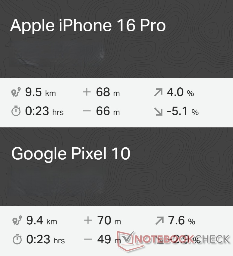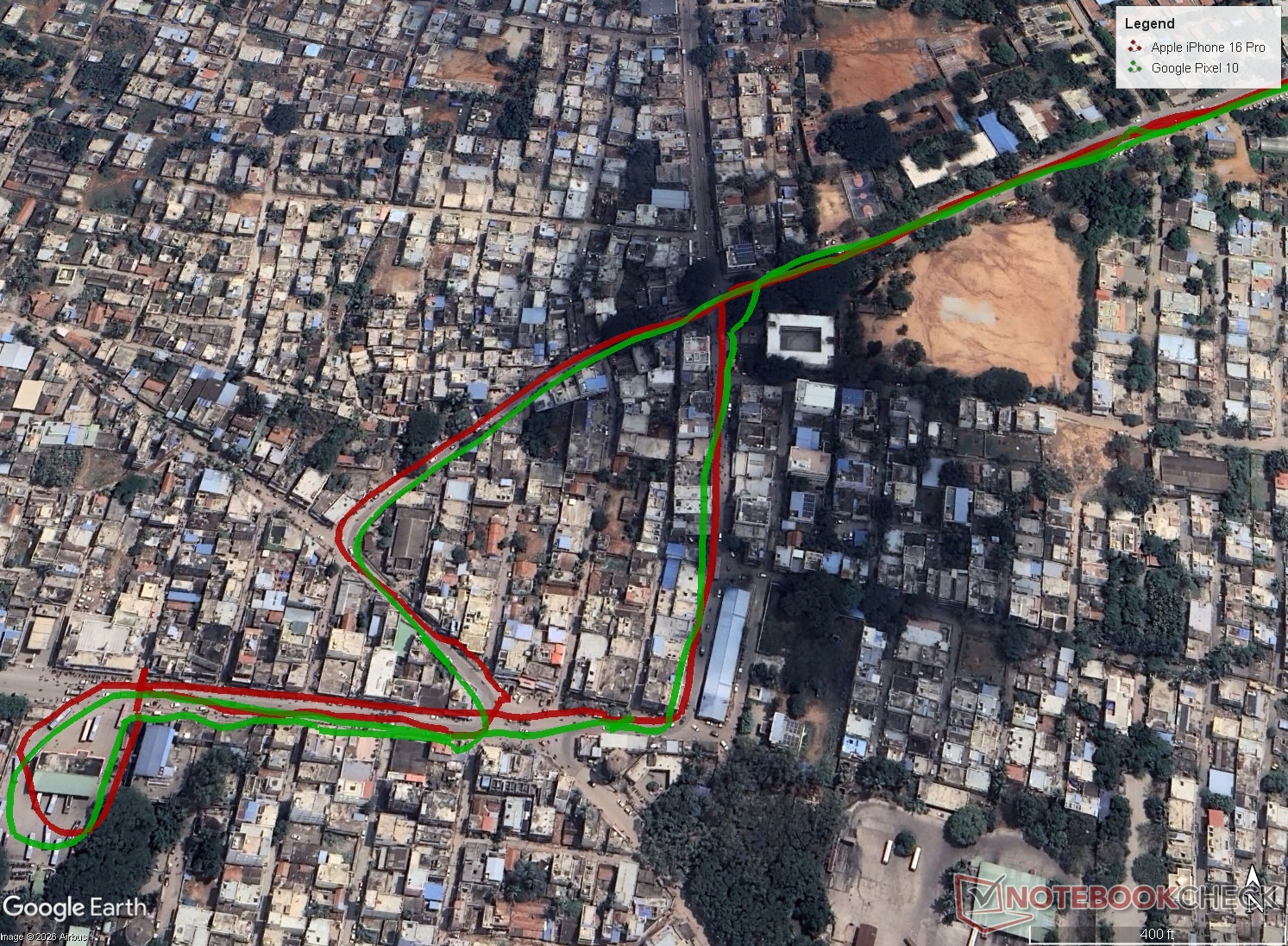 La navigation du Pixel 10 est comparable à celle de l' Apple iPhone 16 Protant sur la route que dans une zone résidentielle dense.