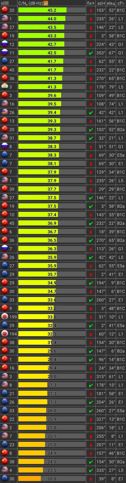 Le Pixel 10 offre une large prise en charge des satellites pour la navigation, notamment le GPS double bande L1+L5, le GLONASS (L1/G1), le Galileo (E1+E5a), le BeiDou (B1C+B2a), le QZSS (L1+L5) et le NavIC (IRNSS L5).
