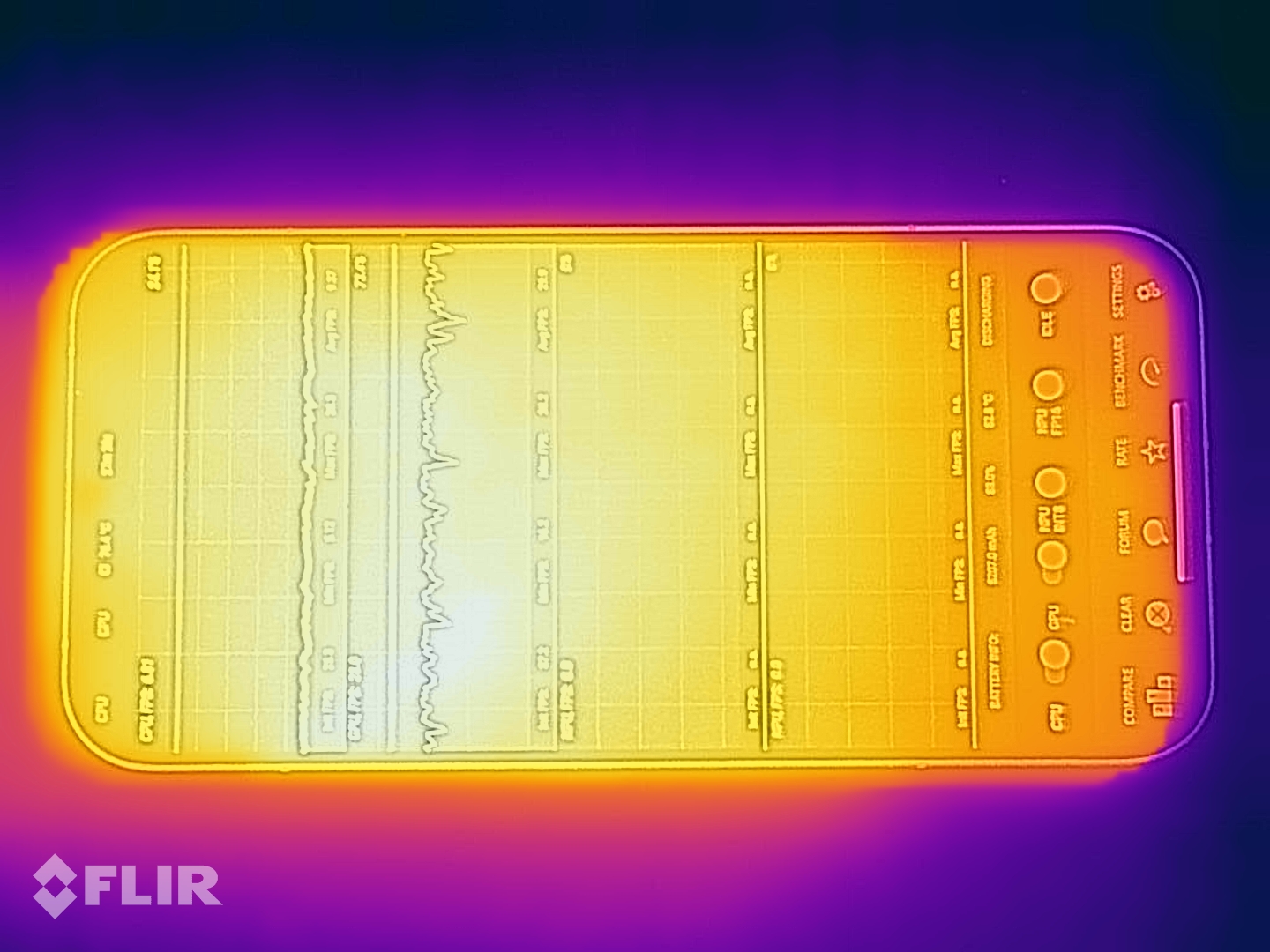 (-) La température maximale du côté supérieur est de 48.7 °C / 120 F, par rapport à la moyenne de 35.2 °C / 95 F, allant de 21.9 à 247 °C pour la classe Smartphone.