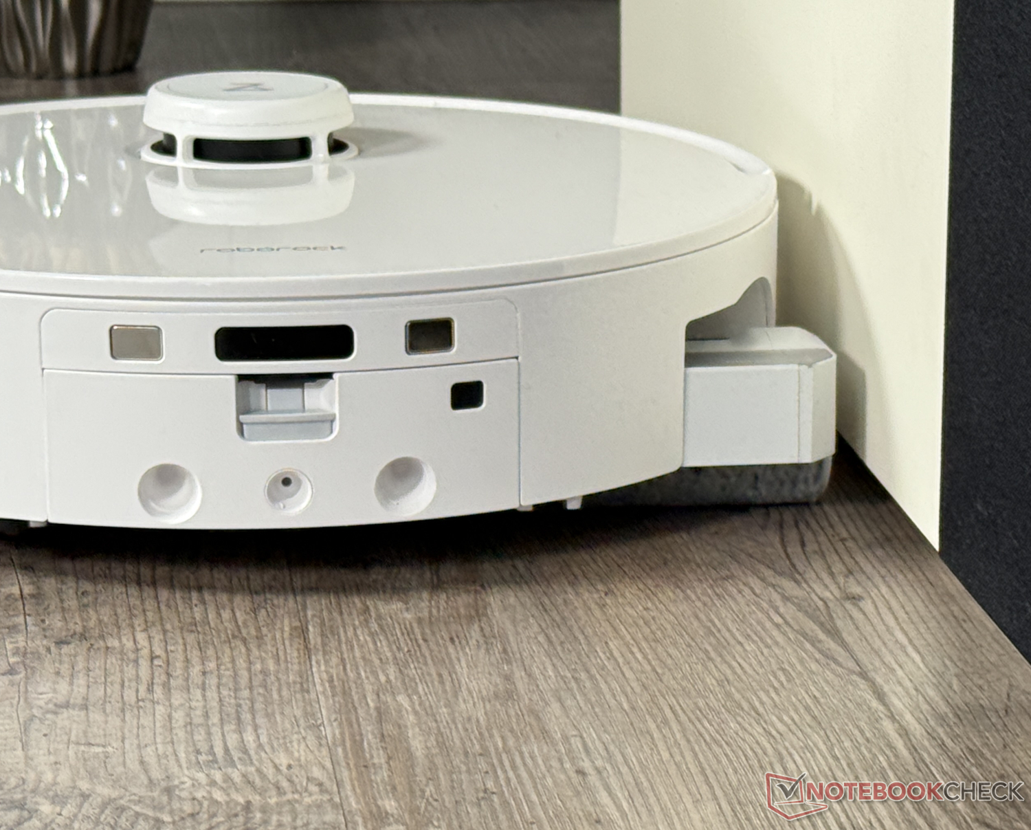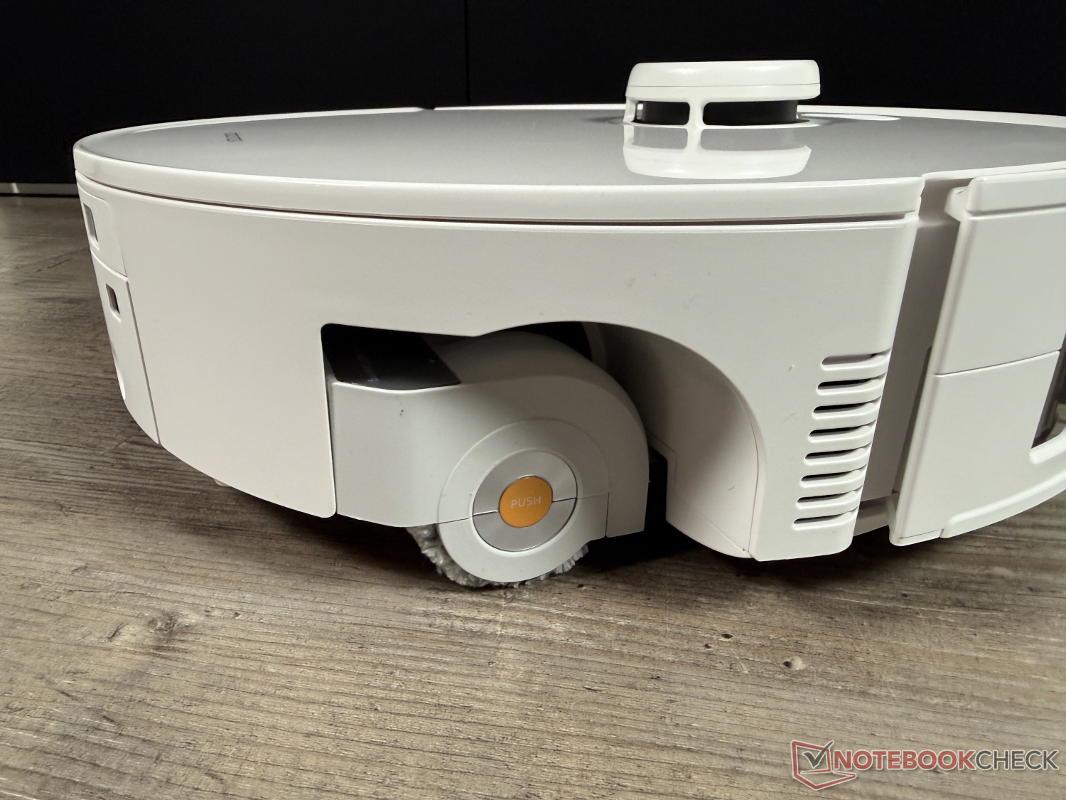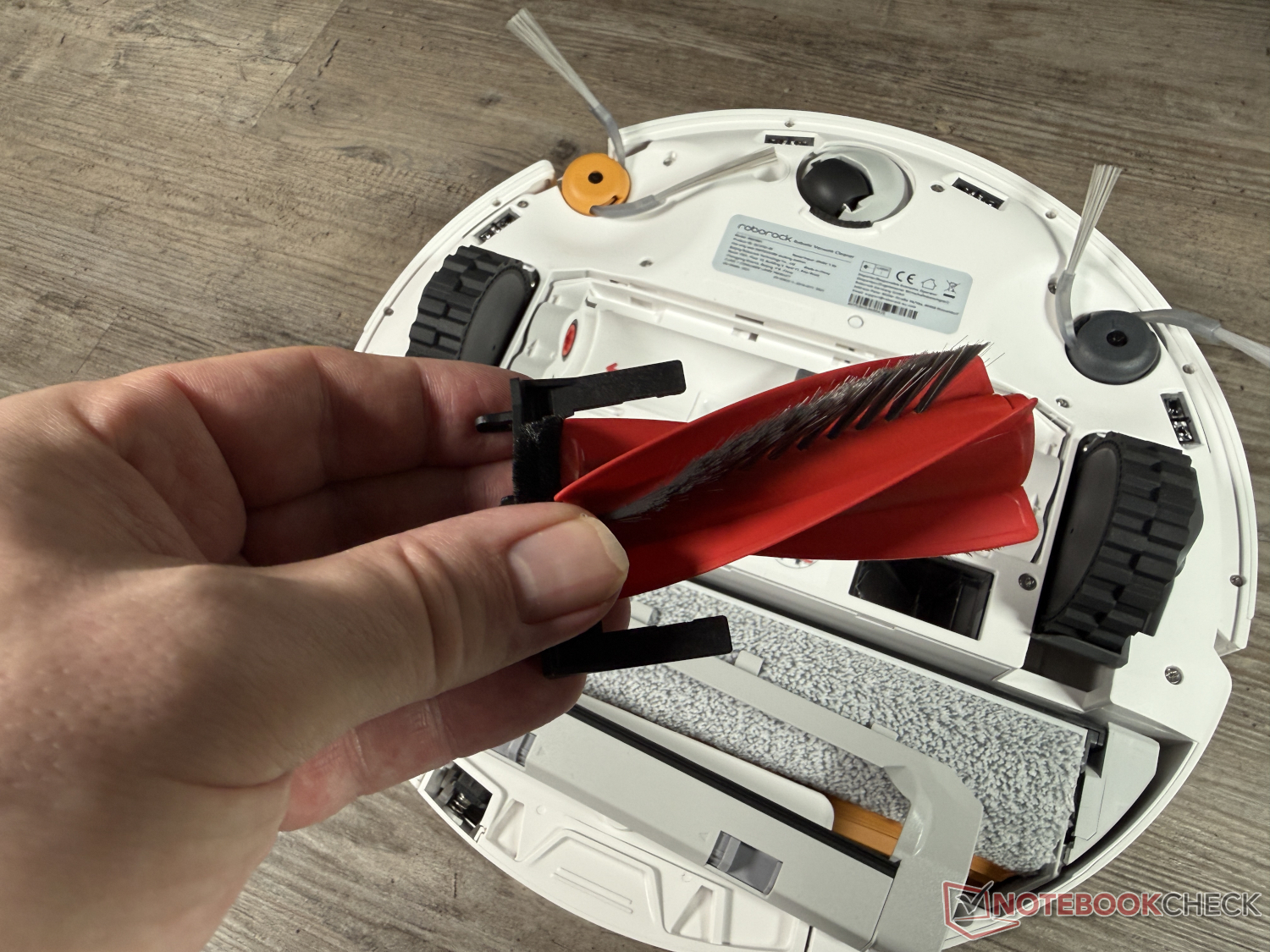 Roborock utilise pour la première fois un rouleau de balayage dans le Qrevo Curv 2 Flow, les modèles précédents étant uniquement dotés d'une serpillière vibrante serpillière vibrante ou deux balais rotatifs dans son portefeuille. Avec ses 27 cm, il est assez large et peut également être étendu latéralement. Toutefois, en raison de la distance de sécurité de quelques millimètres entre la housse en plastique et les meubles ou autres, le nettoyage n'est pas aussi fluide qu'avec les serpillières classiques à fonction extensible.