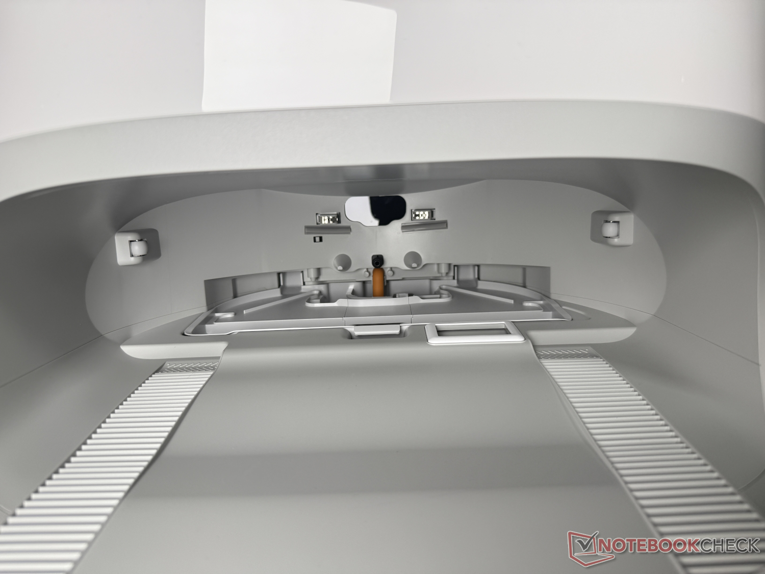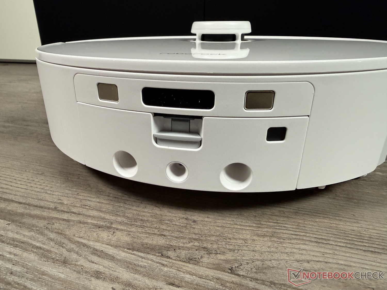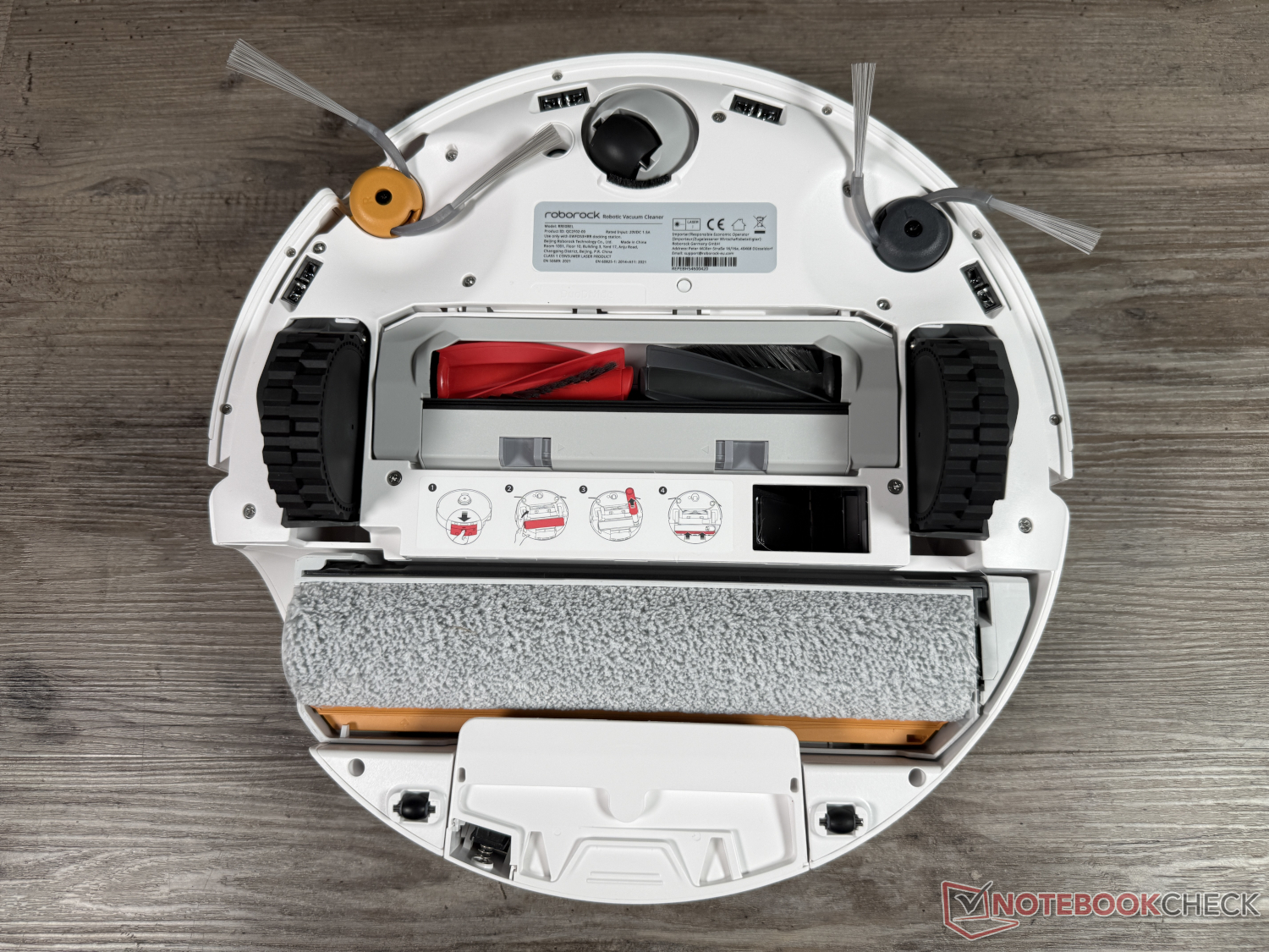 Roborock utilise pour la première fois un rouleau de balayage dans le Qrevo Curv 2 Flow, les modèles précédents étant uniquement dotés d'une serpillière vibrante serpillière vibrante ou deux balais rotatifs dans son portefeuille. Avec ses 27 cm, il est assez large et peut également être étendu latéralement. Toutefois, en raison de la distance de sécurité de quelques millimètres entre la housse en plastique et les meubles ou autres, le nettoyage n'est pas aussi fluide qu'avec les serpillières classiques à fonction extensible.