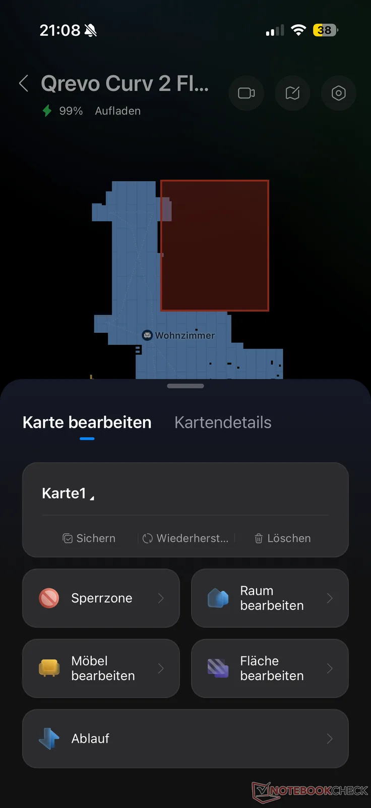 Le Qrevo Curv 2 Flow a scanné son environnement de manière fiable et a créé une carte virtuelle en quelques minutes. C'était déjà très bien en termes de distribution spatiale. Après quelques retouches, notamment en ce qui concerne les zones d'exclusion optionnelles, l'installation a été achevée en 10 à 15 minutes environ.