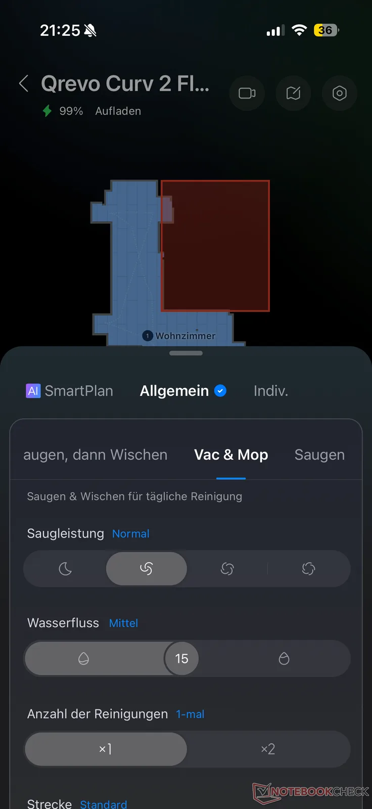 Comme d'habitude, de nombreuses options sont disponibles pour les paramètres de nettoyage, que nous connaissons déjà avec le Qrevo Curv 2 Pro et d'autres modèles Roborock. Cependant, nous avons regretté l'absence d'un mode d'essuyage. Ce mode n'est pas proposé, ce qui, à notre avis, serait logique pour un aspirateur robot axé sur les performances de nettoyage. Au lieu de cela, en plus du réglage individuel et du "AI SmartPlan" avec réglage automatique de l'IA, le Qrevo peut, au choix, "Aspirer, puis passer la serpillière", "Aspirer et passer la serpillière" et "Aspirer". La puissance d'aspiration peut être réglée sur quatre niveaux et l'humidité de la serpillière sur 30 niveaux.