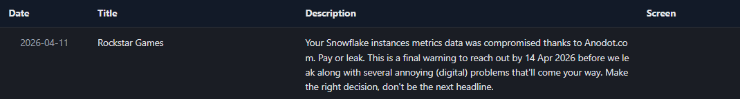 Selon RansomLook.io et CyberSec Gurules attaquants n'ont pas compromis directement le périmètre de Rockstar. Au lieu de cela, ils auraient tiré parti d'une intégration automatisée par le biais d'Anodot, une plateforme tierce de surveillance des coûts de l'informatique en nuage. Le groupe affirme avoir accédé à l'environnement Snowflake de Rockstar (que la société utilise pour stocker et gérer, entre autres, ses données analytiques et la télémétrie des joueurs) en récoltant les jetons d'authentification d'Anodot. Grâce à cette méthode, les attaquants peuvent contourner l'authentification multifactorielle standard en utilisant des jetons de service légitimes qui restent valides pendant de longues périodes. Ce type de vulnérabilité de la chaîne d'approvisionnement semble être devenu un vecteur principal pour les ShinyHunters à la fin de l'année 2025 et au début de l'année 2026.