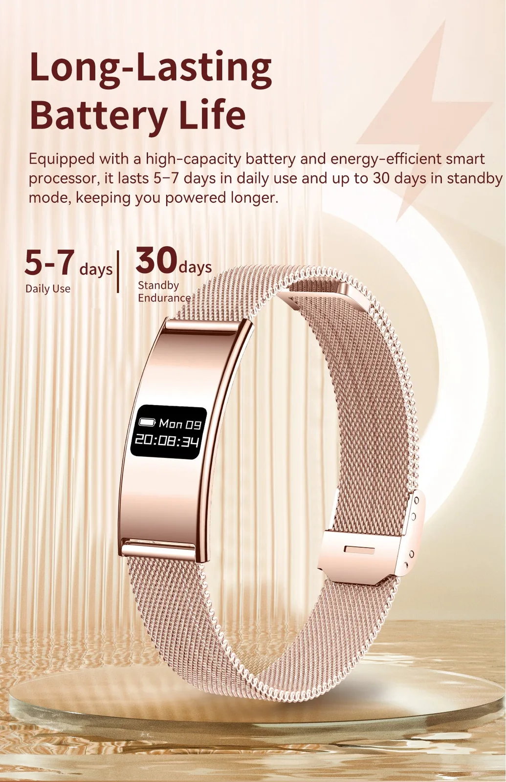 Le bracelet fonctionne avec un processeur OM6626Ble bracelet fonctionne avec un processeur OM6626B, prend en charge Bluetooth 5.3 et fonctionne avec Android 6.0 et plus et iOS 10.0 et plus. L'autonomie de la batterie est estimée à 5 à 7 jours en cas d'utilisation régulière, et jusqu'à 30 jours en veille. Rogbid revendique également une résistance à l'eau de 10 ATM, ce qui signifie qu'il devrait convenir à une exposition quotidienne à l'eau.