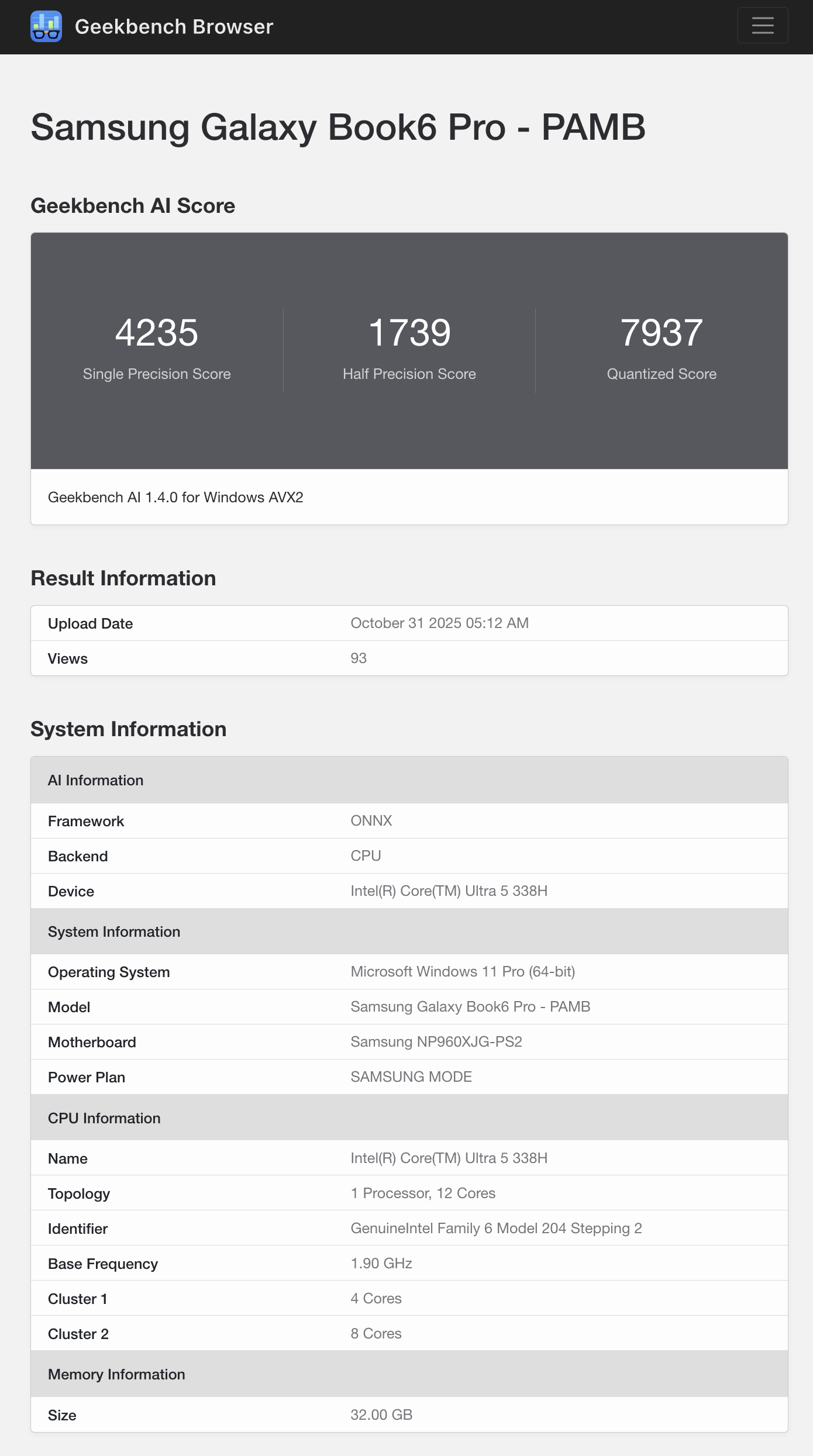 Aujourd'hui, Geekbench précise qu'au moins une variante du Galaxy Book6 Pro sera également livrée avec un processeur Core Ultra 5 338H de la famille Panther Lake d'Intel. Équipé de douze cœurs répartis équitablement entre les performances, l'efficacité et les clusters basse consommation, le Core Ultra 5 338H est censé être plus efficace que ses équivalents Lunar Lake tels que le Core Ultra 5 238V. Par conséquent, le Galaxy Book6 Pro devrait offrir une meilleure autonomie que les modèles de la série Galaxy Book5 tels que le Galaxy Book5 Pro 360 (actuellement 1 358 $ sur Amazon).