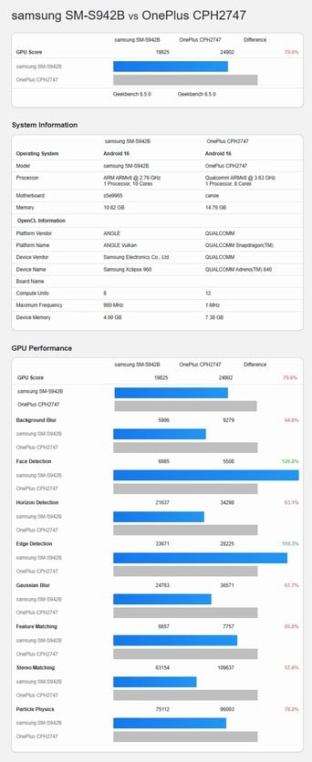 Dans ce cas, il ne s'agit pas d'un benchmark CPU mais d'un test GPU Vulkan et OpenCL. Dans les premiers tests, cette unité graphique était assez proche du Snapdragon 8 Elite Gen 5, que l'on trouve dans le OnePlus 15(à partir de 999 $ sur Amazon) et d'autres téléphones Android. La comparaison n'est pas tout à fait juste, car le Samsung Galaxy S26 sera probablement plus performant dans les semaines à venir grâce à des optimisations logicielles. Malgré cela, le GPU Xclipse 960 offre déjà 88 % des performances du GPU Adreno 840 en Vulkan, ou un peu moins de 80 % en OpenCL.