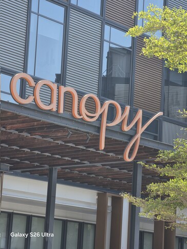 Tout d'abord, le Galaxy S26 Ultra a été confronté à l'iPhone 17 Pro Max. Les images capturées avec leurs appareils photo principaux et leurs téléobjectifs respectifs (5x sur le Galaxy S26 Ultra et 4x sur l'iPhone 17 Pro Max) démontrent une fois de plus que Samsung opte pour une science des couleurs sobre mais plus réaliste - un point souligné par le leaker et critique de Samsung Ice Universe dans un post de réaction https://x.com/UniverseIce/status/2026335765660422144. Dans le téléobjectif du logo de l'hôtel, Apple a fourni un contraste nettement plus élevé, tandis que le rendu de Samsung semble plus proche de l'aspect réel du sujet, bien qu'il puisse nécessiter une certaine édition pour se démarquer sur les médias sociaux