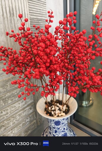 Le rendu précis du vase contenant des baies artificielles rouges (visibles sur les premières photos) représente un léger défi pour tous les appareils. Il convient de noter que l'image lumineuse et surexposée de Vivo est probablement loin d'être exacte et qu'elle semble également floue à certains endroits. Nous préférons personnellement le rendu du Galaxy S25 Ultra