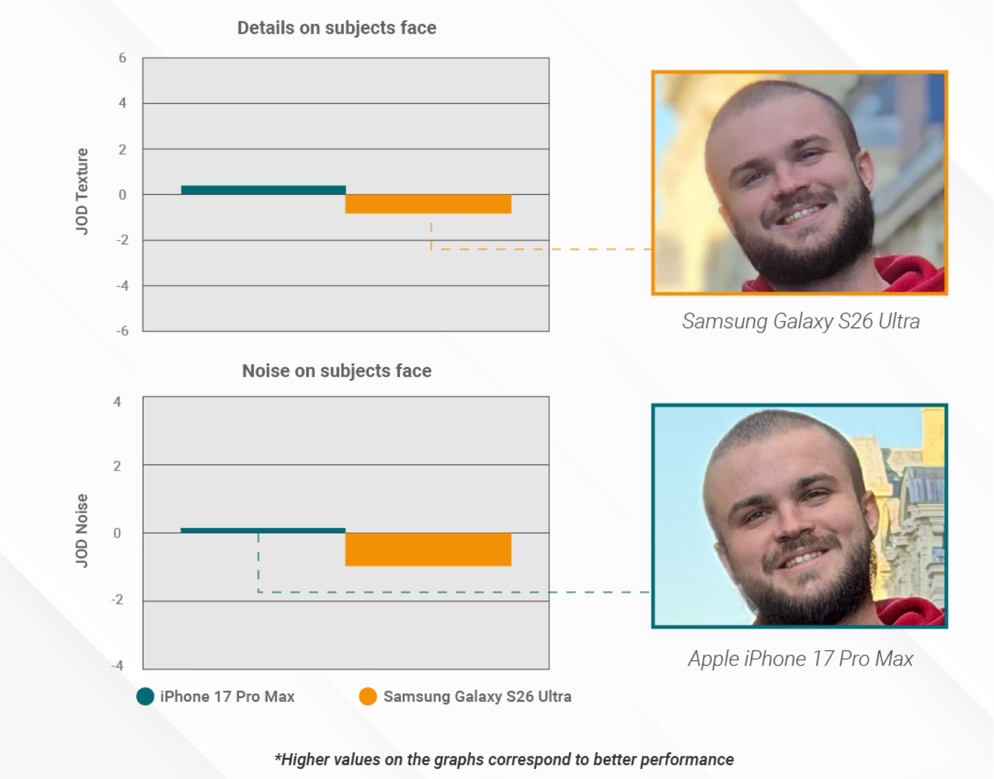 Deuxièmement, le Galaxy S26 Ultra capture des tons chair beaucoup plus précis en basse lumière que le Galaxy S25 Ultra. Cependant, DxOMark souligne que l'appareil photo principal de l'iPhone 17 Pro Apple enregistre encore plus de détails et a moins de bruit d'image que l'appareil photo principal amélioré du Galaxy S26 Ultra. DxOMark critique également le fait que l'autofocus n'arrive pas toujours à capturer les visages avec précision et que la simulation du bokeh ne fonctionne pas parfaitement, ce qui entraîne des artefacts visibles