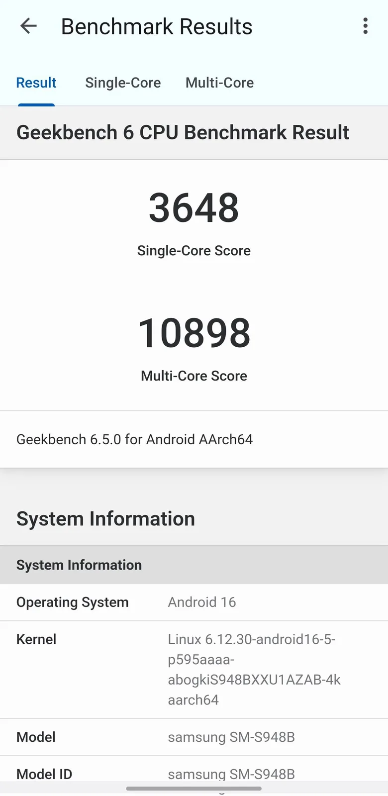Comme l'indique Sahil Karoul, le Galaxy S26 Ultra obtient un score monocœur de 3 648 sur Geekbench 6, et un score multicœur de 10 898. Ces deux chiffres sont tout à fait dans la moyenne par rapport au Snapdragon 8 Elite Gen 5 que nous avons testés, et certains considéreraient cela comme décevant. Après tout, le Galaxy S26 Ultra est équipé d'une variante Snapdragon 8 Elite Gen 5 avec des cœurs principaux cadencés à 4,74 GHz, contre 4,61 GHz pour la version standard du chipset.