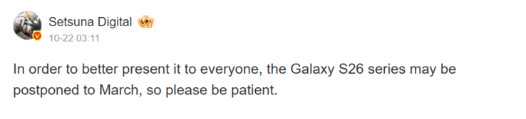 Les premières rumeurs concernant le lancement en mars de la famille Galaxy S26 provenaient de Grèce. Selon un rapport de ce pays d'Europe du Sudles fans de Samsung pourraient devoir attendre deux mois de plus que prévu pour le successeur du Galaxy S25 Ultra (disponible ici sur Amazon). À l'époque, nous étions légèrement sceptiques quant à l'éventualité d'un tel report du lancement. Cependant, de plus en plus de sources indiquent un retard important. Le très réputé leaker Setsuna Digital a révélé sur Weibo que la série Galaxy S26 pourrait n'être dévoilée qu'en mars 2026