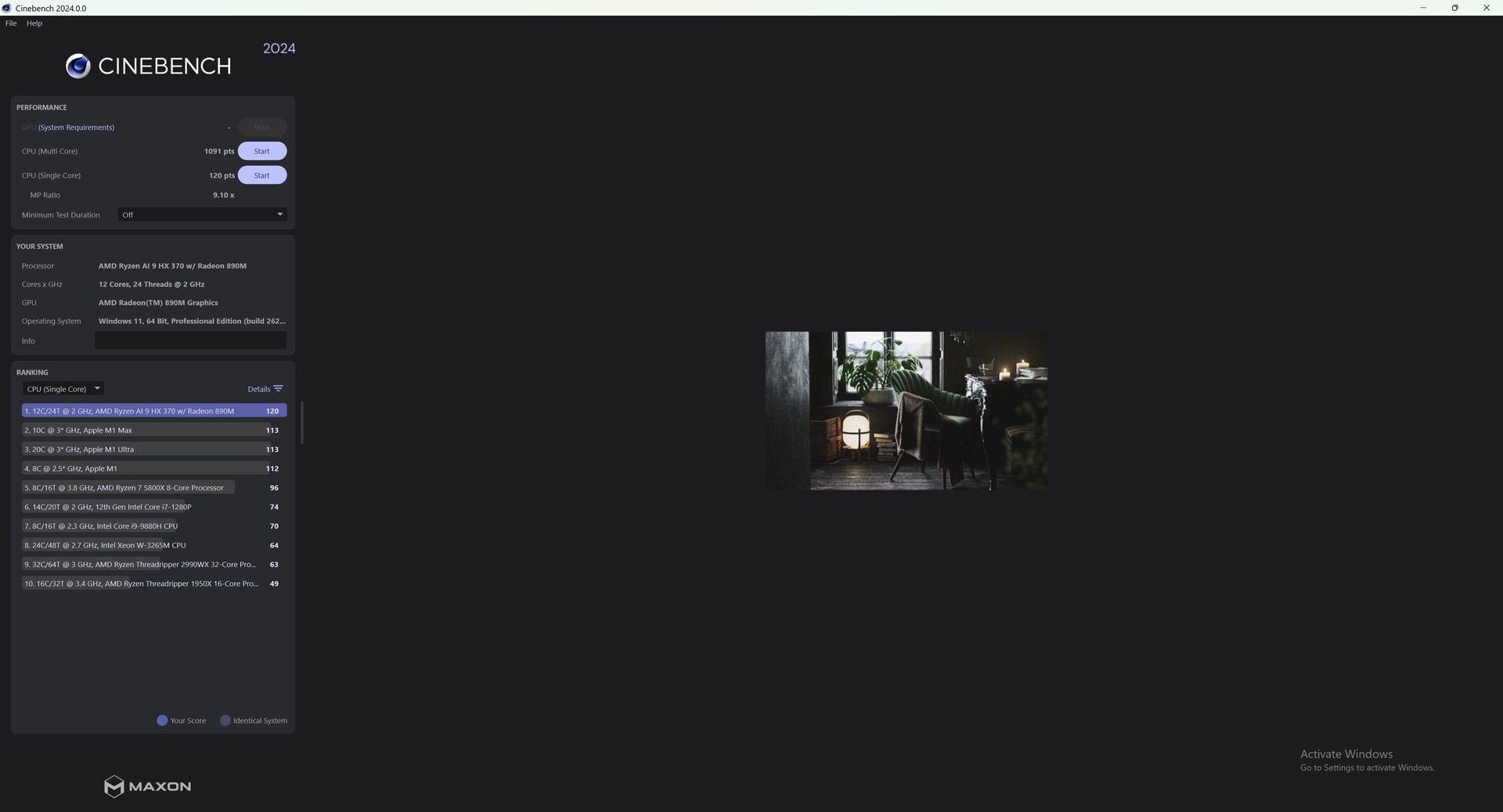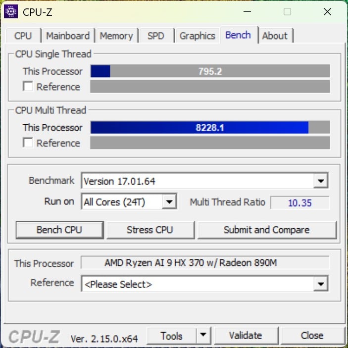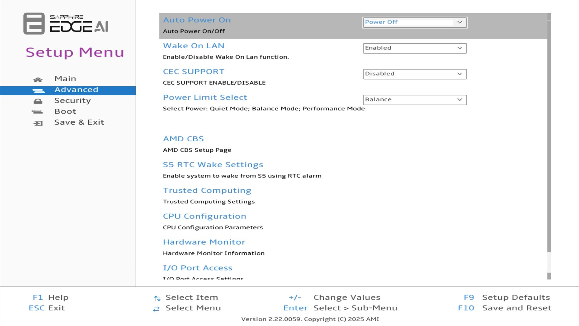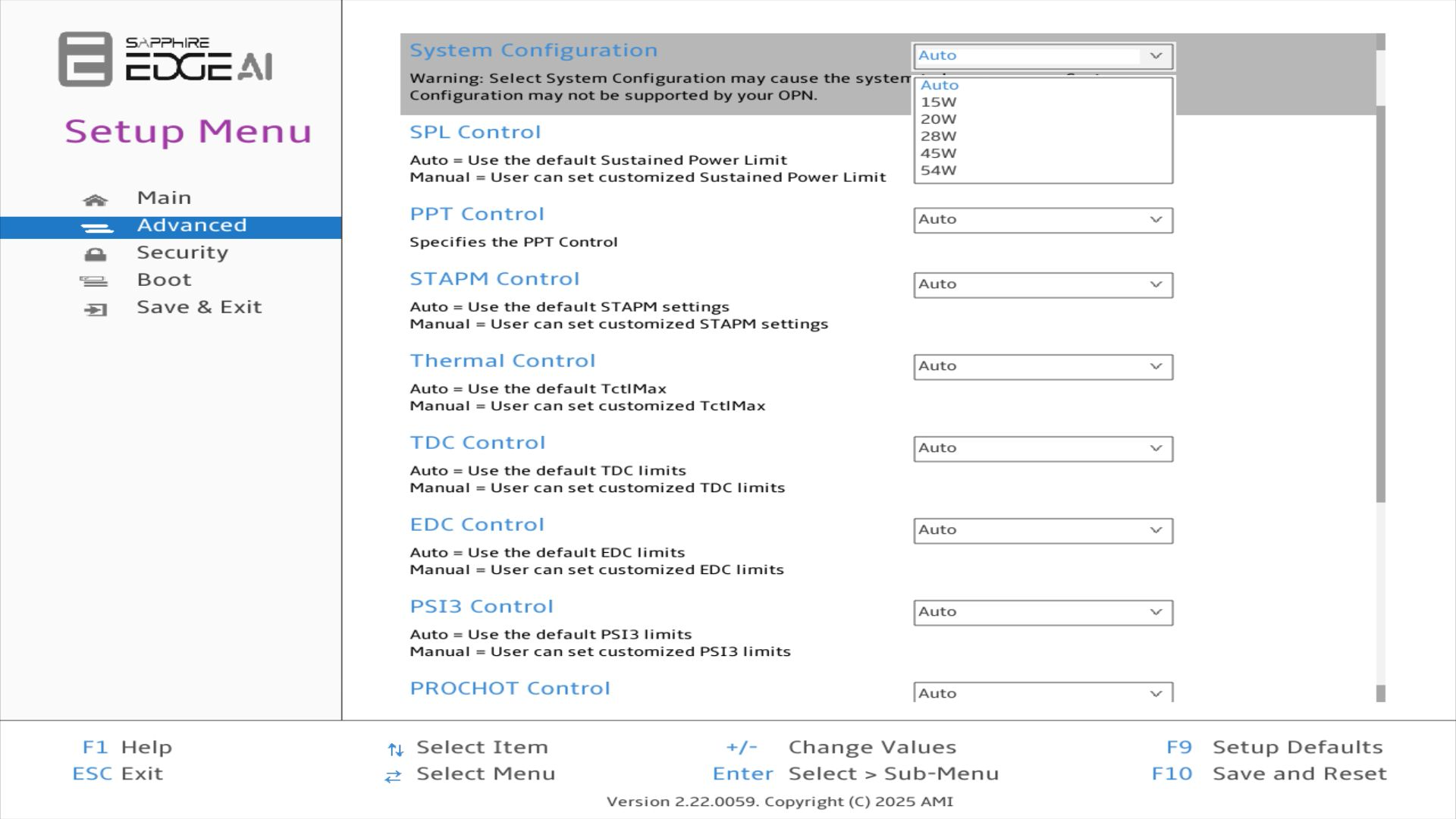Le Sapphire Edge AI intègre la technologie AMD Ryzen AI 9 HX 370 une puce à 12 cœurs de l'architecture Zen 5 qui offre des performances impressionnantes dans les applications à un ou plusieurs cœurs. En configuration d'usine, le SoC fonctionne avec une consommation continue de 35 watts et offre donc des performances comparables à celles de la concurrence. Bien qu'il soit possible de sélectionner différents profils de performance dans le BIOS, les différences sont à peine perceptibles dans l'utilisation quotidienne, même si elles sont mesurables.