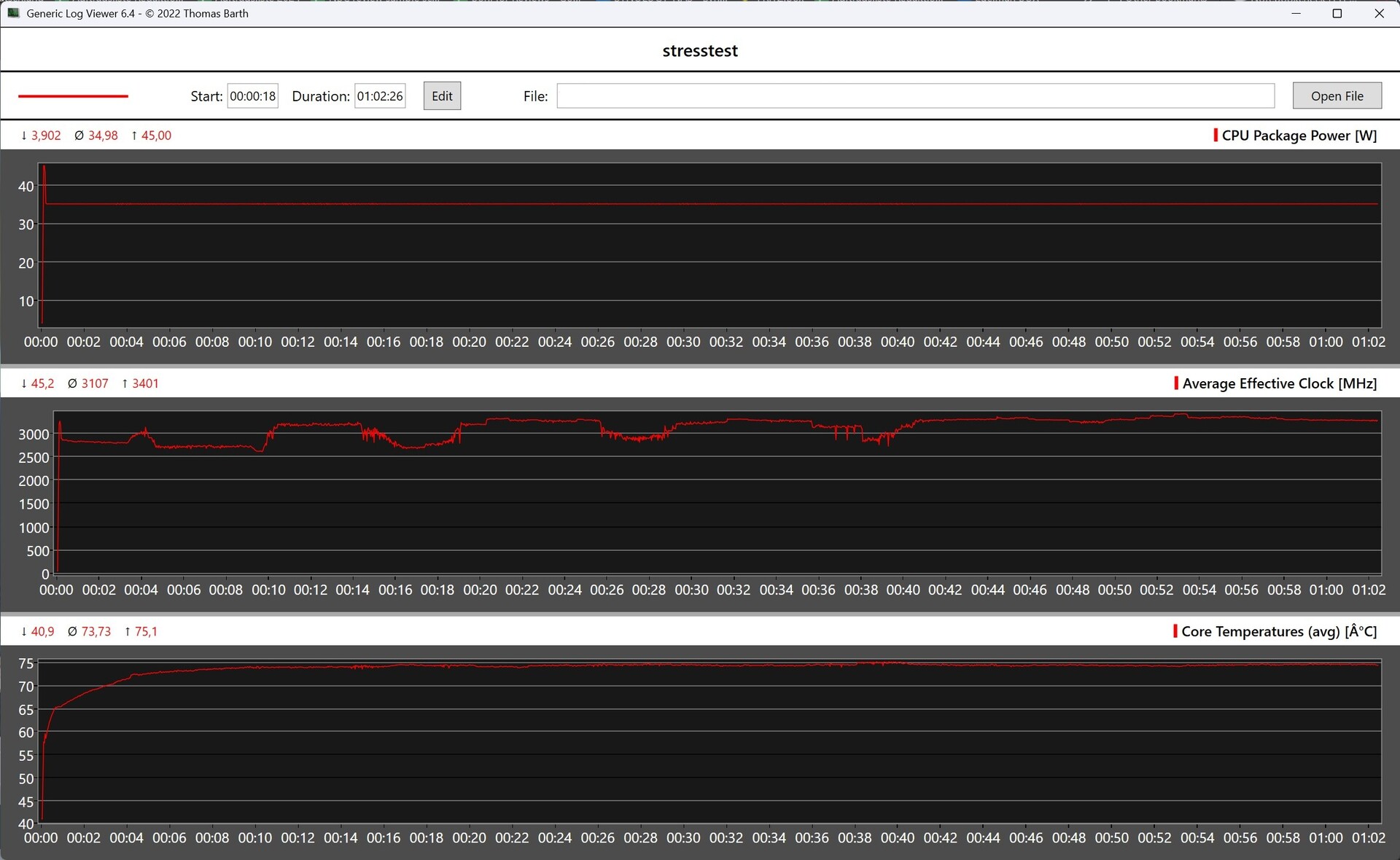 Le boîtier du Sapphire Edge AI reste discret, aussi bien en mode veille qu'en charge. La partie supérieure chauffe un peu plus que les autres zones en raison de la connexion passive du SSD. Lors du test de stress, le Ryzen AI 9 HX 370 atteint brièvement 75°C, mais ce n'est pas critique. Les données télémétriques montrent que le système de refroidissement peut facilement maintenir le TDP de 35 watts appliqué en permanence.