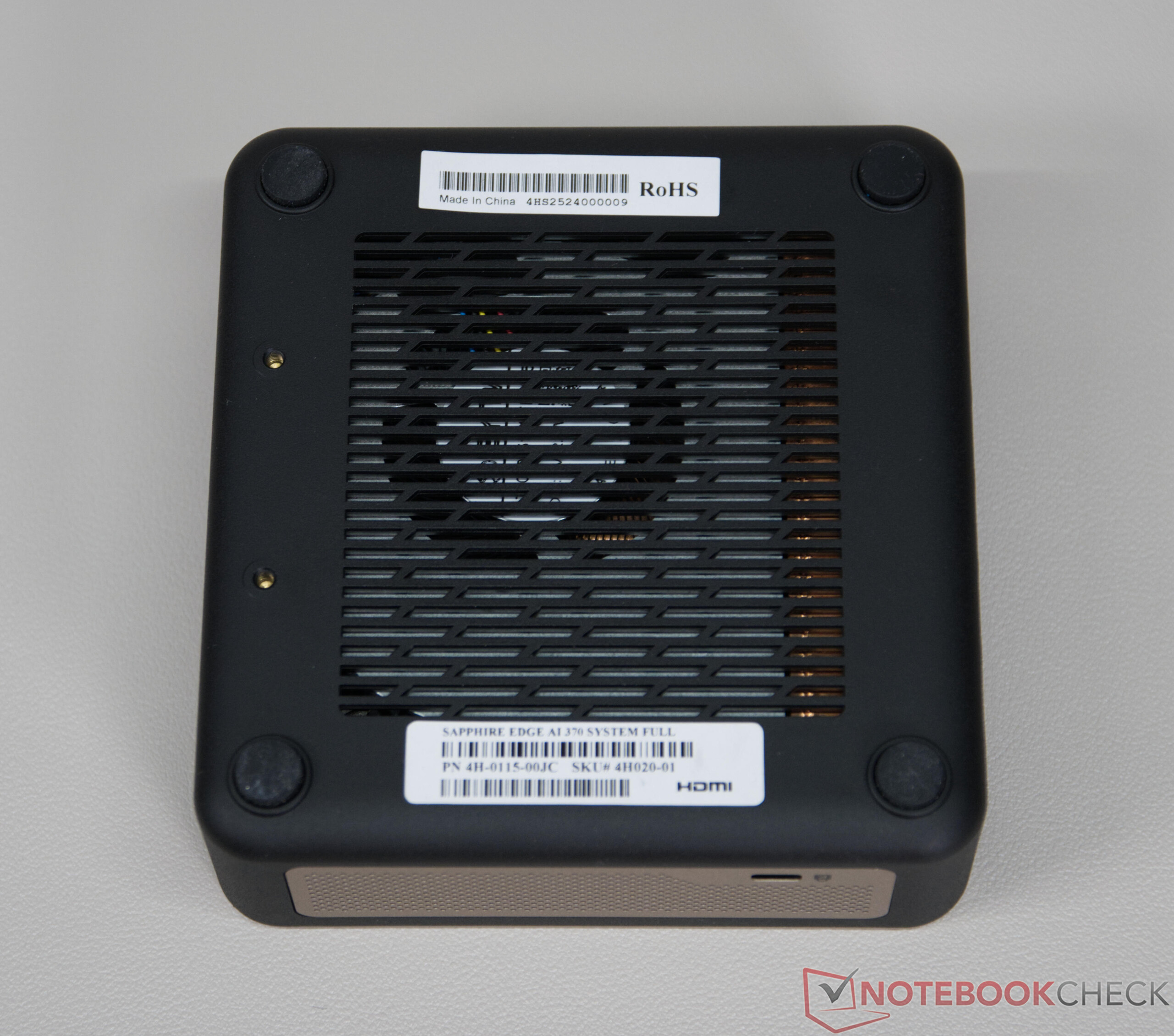 Le Sapphire Edge AI a un boîtier très compact qui semble de grande qualité grâce à sa couleur noire et dorée. En revanche, au niveau du toucher, le Sapphire Edge AI n'arrive pas à la cheville des châssis métalliques de haute qualité de concurrents tels que le Geekom. Sapphire mise sur un châssis en plastique traité avec soin, ce qui se reflète également dans son faible poids.