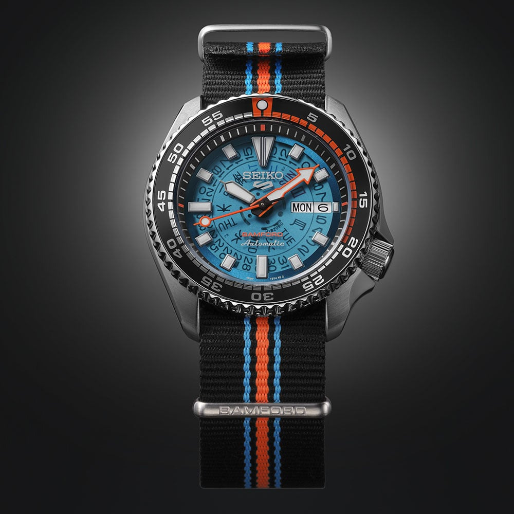 Ce modèle en édition limitée fait référence aux archives de la gamme Seiko 5 Sports "SKX" et arbore un thème "Retro Future" dans l'ensemble de son design. Le cadran squeletté présente de nombreux éléments lumineux (et non conventionnels) inspirés de Bamford, notamment un cadran sarcelle accentué par des éléments orange, bleus et blancs audacieux sur le cadran et le bracelet en nylon. Les aiguilles, les index et la lunette sont traités avec LumiBrite. Le logo Bamford se trouve à 6 heures, sur le fond du boîtier et sur la boucle métallique personnalisée du bracelet. La montre possède un fond de boîtier transparent avec les numéros de série individuels.