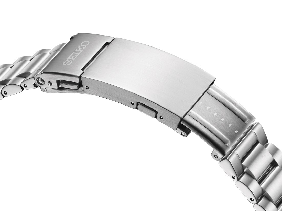 La plus grande amélioration est le nouveau système de fermoir, qui Seiko a introduit pour la première fois sur son modèle phare, la Marinemaster, et qui vous permet d'ajuster le fermoir en six étapes précises, "chacune mesurant environ 2,5 mm, pour une plage totale d'environ 15 mm" Non seulement ce système vous permet de trouver la taille parfaite pour le port quotidien, mais Seiko affirme qu'il est particulièrement utile pour s'adapter aux changements de taille du poignet lors de la plongée.