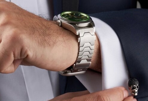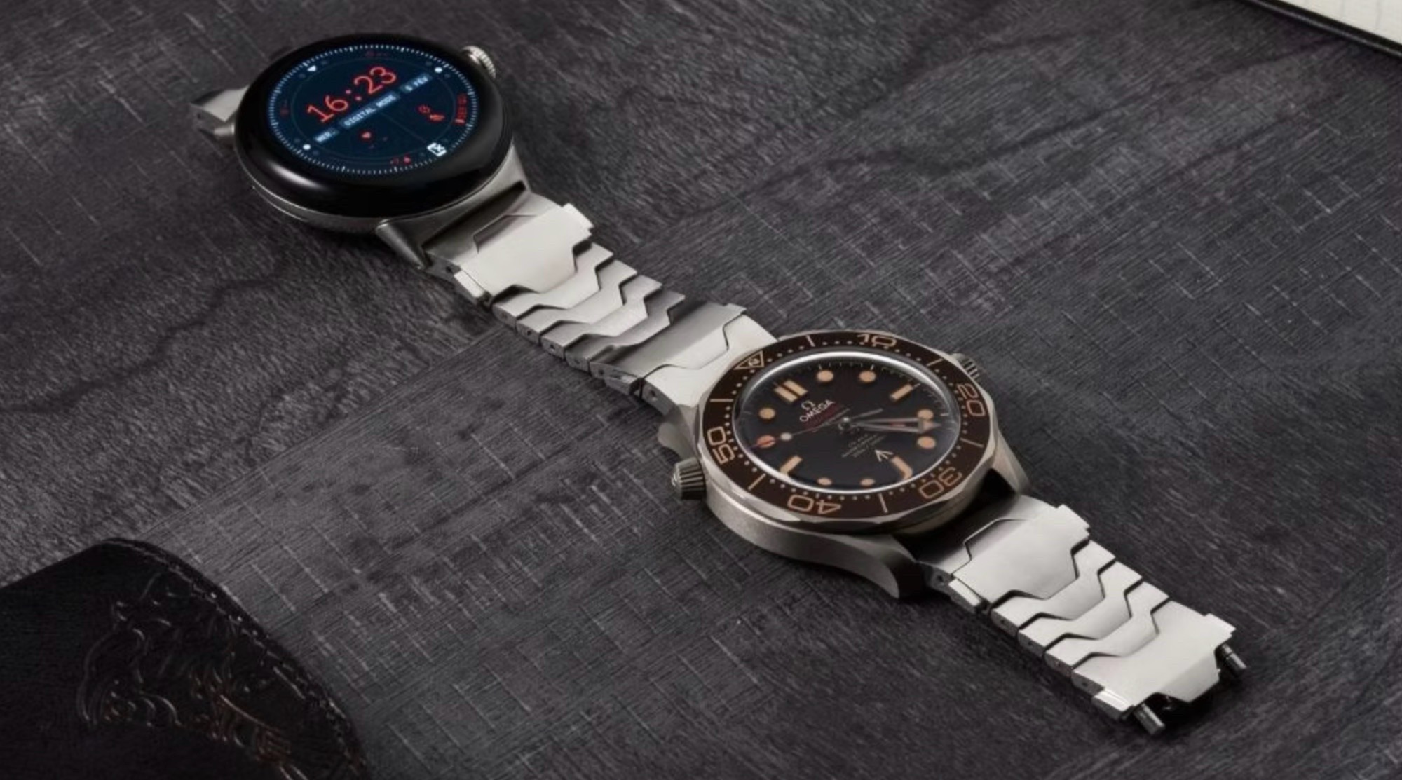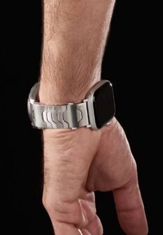 Le bracelet est disponible en trois versions : acier inoxydable en argent ou en noir, ou titane en gris. Un fermoir rapide à peine visible sur le maillon supérieur permet d'ouvrir le bracelet d'un seul geste. La longueur peut être ajustée en enlevant ou en ajoutant des maillons à l'aide de l'outil fourni. Pesant entre 60 et 100 grammes, selon le matériau et la longueur, le bracelet est assez lourd et son poids augmente encore lorsque deux montres y sont attachées. La deuxième montre peut être remplacée par un fermoir conventionnel si vous le souhaitez