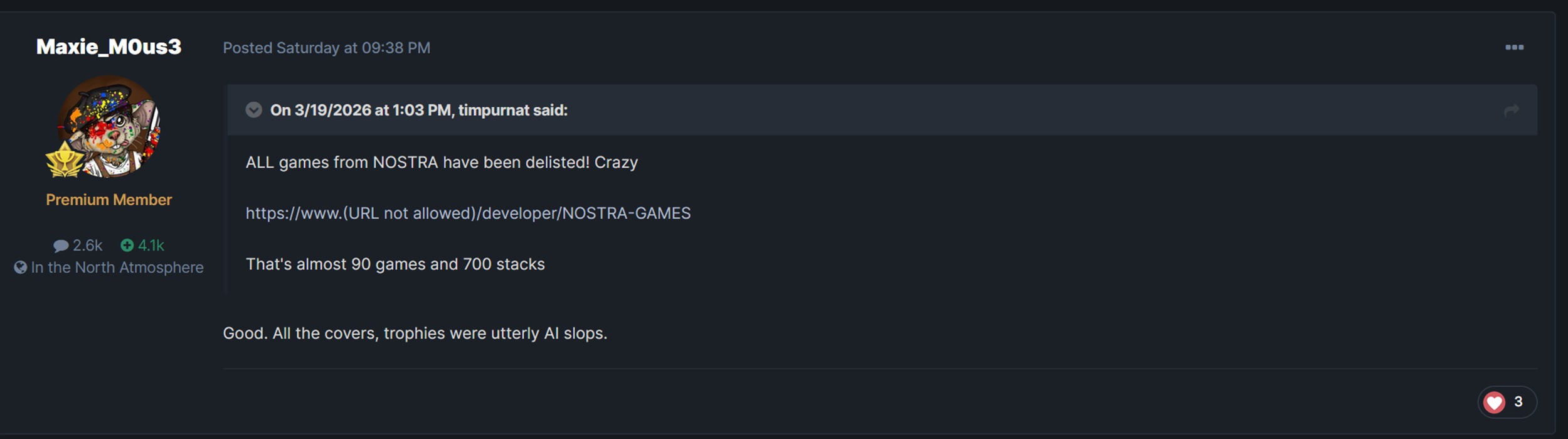 Si l'on tient compte des variations régionales, Nostra Games a vu 700 jeux disparaître. Comme le rapporte le site Delisted Games l'entreprise a réagi à la nouvelle sur Discord. Elle a confirmé qu'elle n'avait pas été prévenue à l'avance, mais qu'elle prévoyait de continuer à publier des titres sur le Nintendo eShopxbox et Steam.