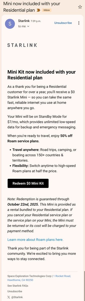 Les abonnés résidentiels chanceux qui ont reçu l'e-mail à l'adresse https://www.reddit.com/r/Starlink/comments/1o1tztj/starlink_deal_spacex_is_offering_longtime_us_and/ pourront réclamer une parabole Starlink Mini sans frais supplémentaires. Il vous suffit de cliquer sur le bouton "Redeem $0 Mini Kit" dans le courriel, de confirmer la commande et l'antenne sera livrée à votre adresse. SpaceX précise que le lien de remboursement est valable jusqu'au 22 octobre. En outre, l'e-mail mentionne également que les utilisateurs bénéficieront d'une réduction de 50 % sur les plans Roam, ce qui signifie que vous n'aurez à payer que 82,5 $ pour le plan Roam Unlimited et 25 $ pour Mini Roam. Habituellement, ces forfaits coûtent respectivement 165 et 50 dollars. On ne sait pas encore si la réduction est valable uniquement pour les premiers mois du service ou s'il s'agit d'un avantage permanent pour les utilisateurs résidentiels éligibles.