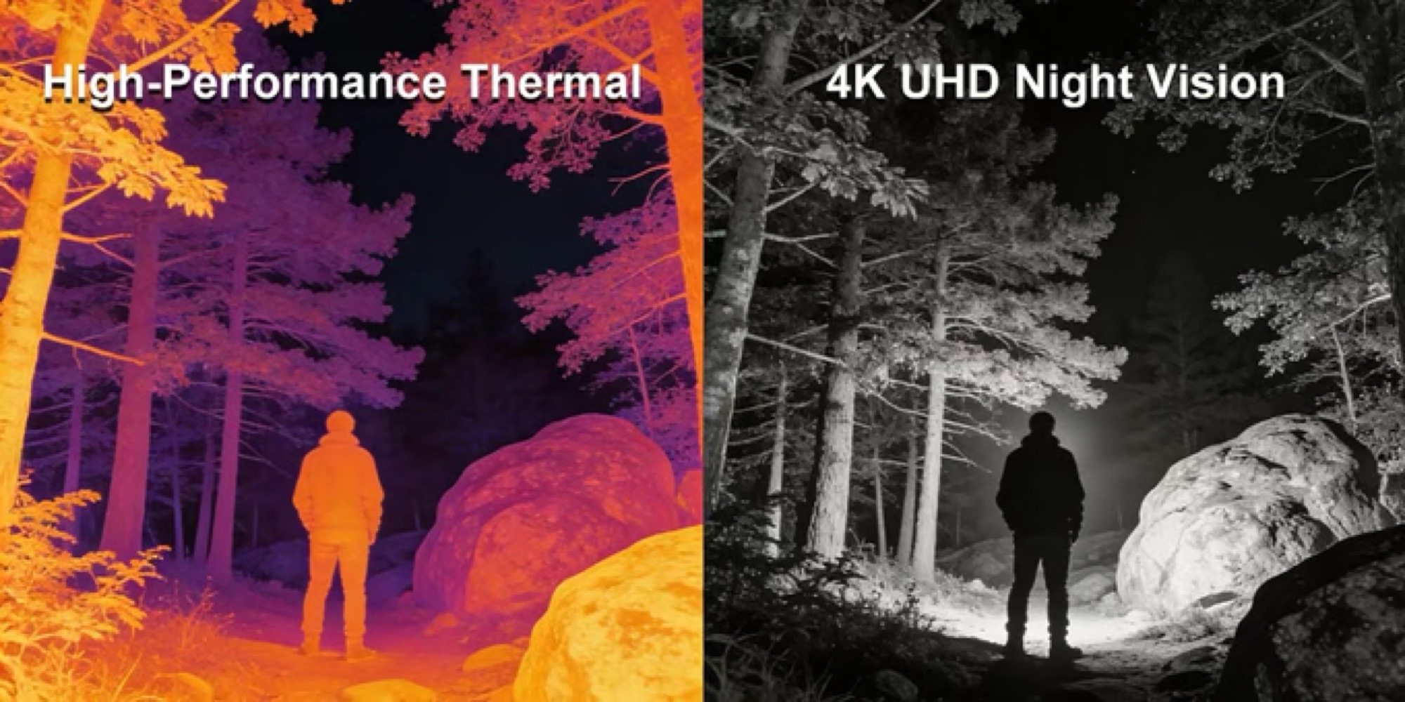 SpectraEyes intègre deux caméras dans un boîtier relativement compact. L'une d'entre elles est une caméra de vision nocturne classique qui peut enregistrer des vidéos en 4K. Le capteur n'est pas équipé d'un filtre infrarouge, de sorte que les vidéos peuvent être enregistrées même dans l'obscurité absolue grâce à la lumière infrarouge intégrée.