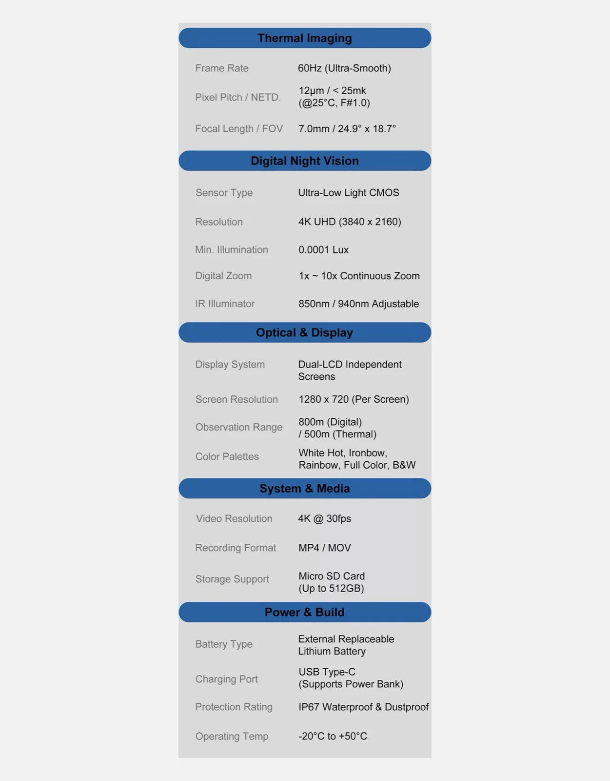 Le fabricant annonce un zoom décuplé, mais en raison du manque d'informations, on peut supposer qu'il s'agit d'un zoom numérique, ce qui a un impact négatif sur la qualité de l'image. SpectraEyes propose également une caméra thermique capable d'enregistrer 60 images par seconde, mais la résolution de cette caméra n'est pas précisée. La batterie est censée offrir une autonomie de quatre à cinq heures lorsque l'on utilise la caméra de vision nocturne, ou de deux heures lorsque l'on utilise les deux caméras. Deux écrans, d'une résolution de 1 280 x 720 pixels chacun, affichent simultanément les vidéos des deux caméras