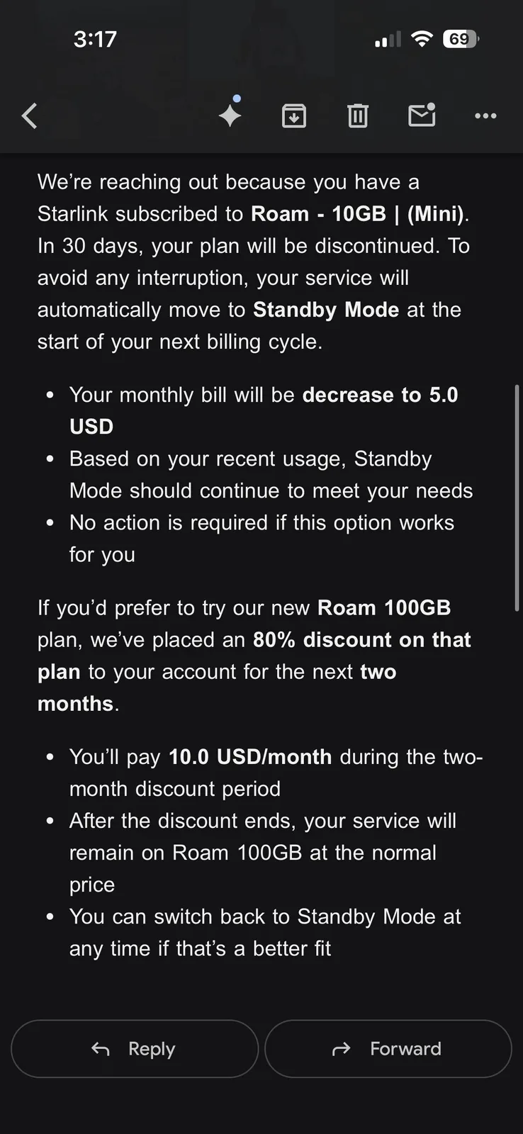 Outre le plan à 10 $, Starlink a également cessé récemment d'offrir le plan à 40 $/mois avec 10 Go de données à haut débit en mode veille 40 $/mois qui était son plan résidentiel le moins cher, et l'a déplacé vers le plan "Roam" Roam mais seulement pour certains utilisateurs. Cette option a ensuite été complètement supprimée, tandis que Starlink a a doublé l'allocation de base de 50 $/mois pour les données en itinérance et a réduit le prix de la mini parabole de 20 % en guise de compensation.