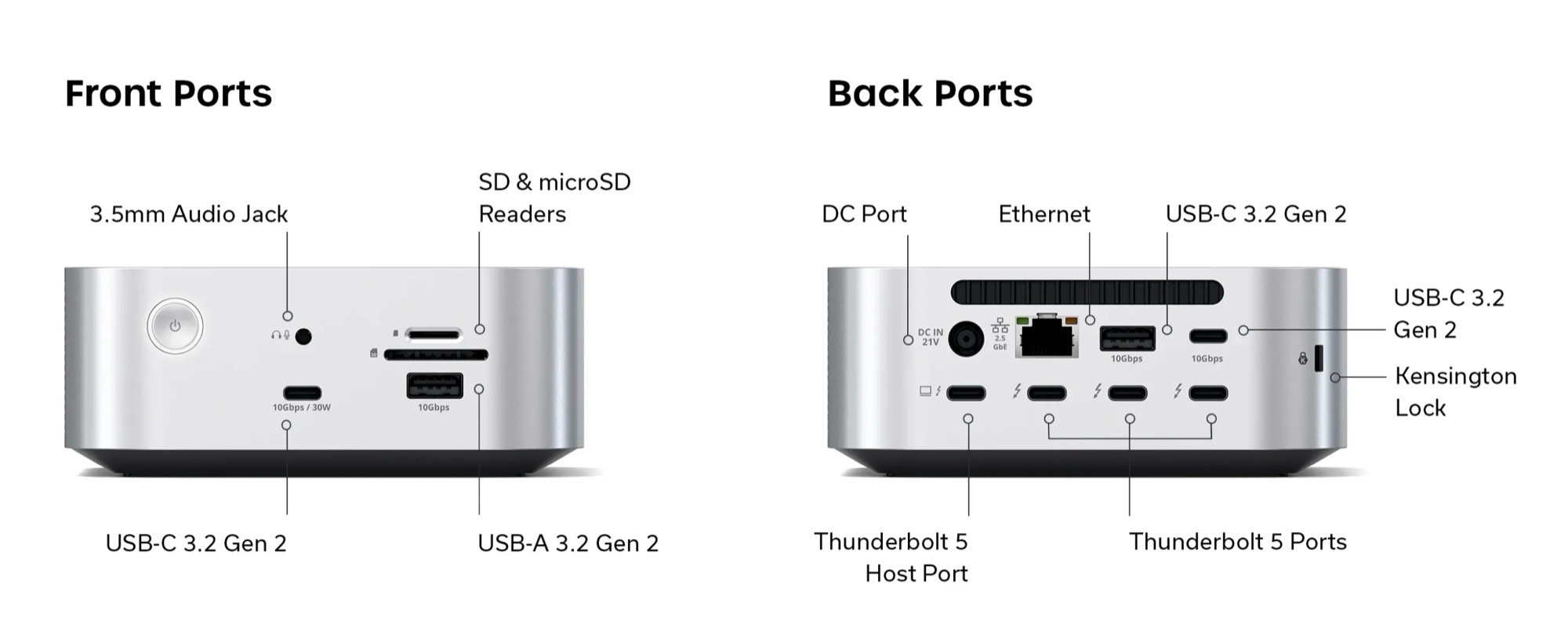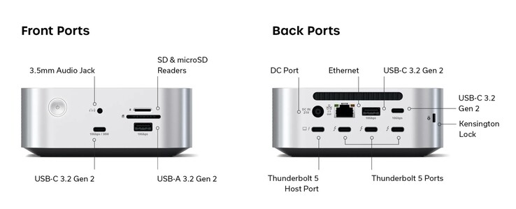 La station d'accueil se connecte via Thunderbolt 5 avec une bande passante de 120 Gbps et peut charger les ordinateurs portables via le même câble avec une puissance maximale de 140 watts. La station d'accueil est également compatible avec les Mac qui ne prennent en charge que Thunderbolt 4, bien qu'avec des performances réduites. À l'avant de la station d'accueil se trouve un port USB-C qui peut charger des appareils jusqu'à 30 watts et transférer des données à 10 Gbps. En outre, l'avant comporte une prise casque de 3,5 mm, un port USB-A et un lecteur de cartes SD et microSD.