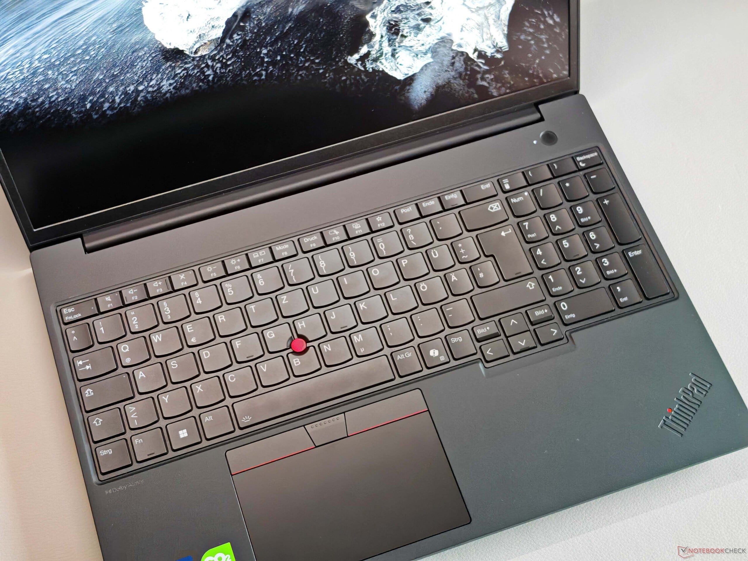 Le clavier rétroéclairé, y compris le pavé numérique, est également conforme à la norme ThinkPad actuelle, bien qu'il existe des modèles nettement plus performants dans la gamme actuelle (par ex ThinkPad P1 16 G8). Dans l'ensemble, nous décririons la sensation de frappe comme confortable et précise, mais la concurrence peut faire au moins aussi bien. Le ClickPad (11,5 x 6,7 cm) est assez petit par rapport aux normes modernes en raison des boutons TrackPoint dédiés, mais le fonctionnement est excellent et les clics mécaniques dans la zone inférieure sont également de très haute qualité. Cela vaut également pour les boutons TrackPoint.