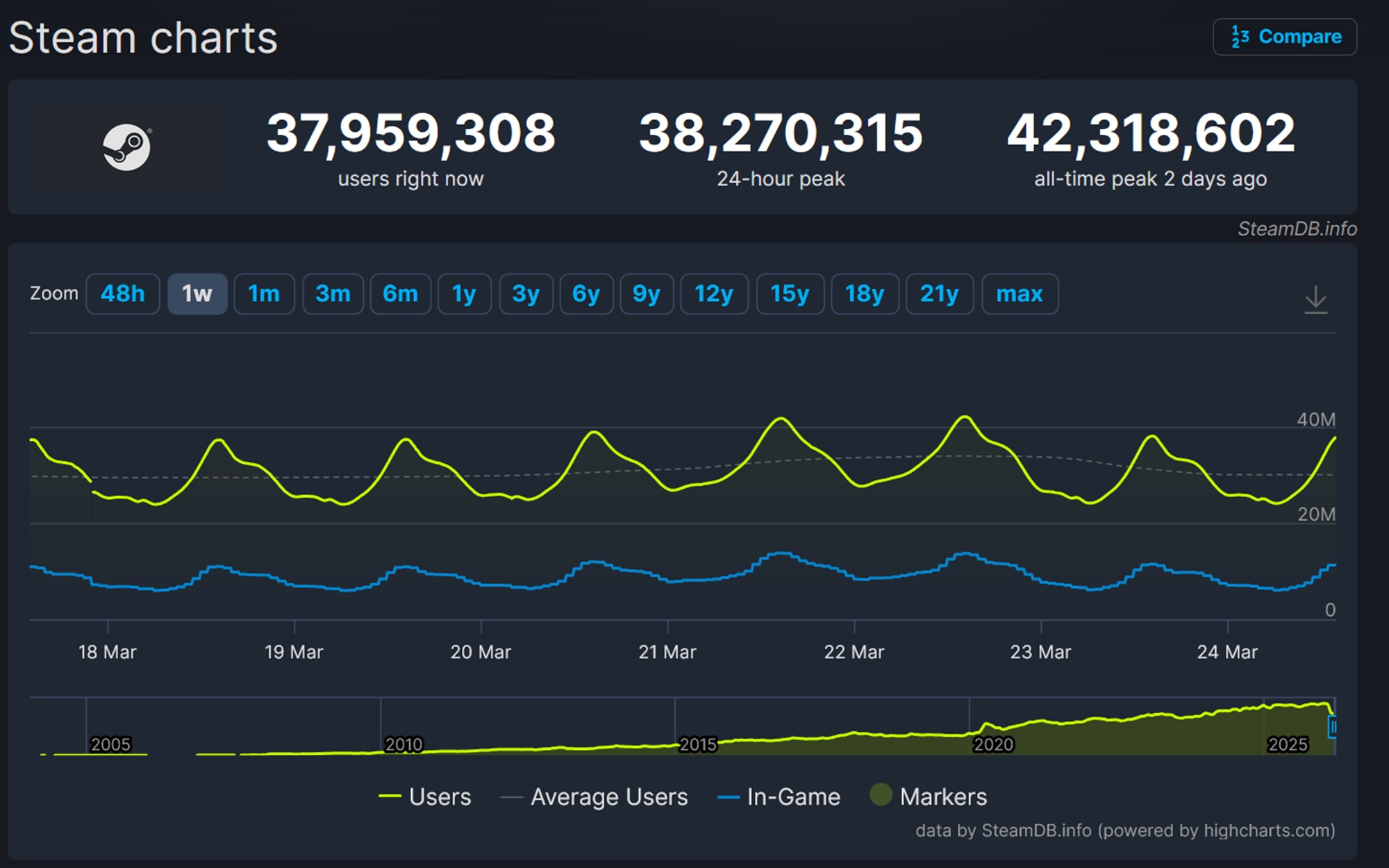 Il semble que chaque mois, Valve établisse un nouveau record pour confirmer sa domination. Le dernier exploit de la place de marché est d'avoir dépassé son précédent record d'utilisateurs simultanés, qui s'élevait à plus de 42 millions de 42 millions d'utilisateurs simultanés en janvier en janvier. Avec la récente Crimson Desert ce chiffre est passé à 42,3 millions le 22 mars.