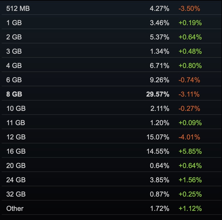 Dans une récente mise à jour bêta du client Steam , Valve a déclaré que certains problèmes avaient été résolusvalve a déclaré que certains problèmes avaient été résolus concernant les rapports sur la VRAM, ce qui indique que les enquêtes précédentes ont pu contenir des données erronées. En outre, pour les systèmes dotés de plusieurs GPU, Steam n'indiquera désormais que le GPU disposant de la plus grande quantité de VRAM.